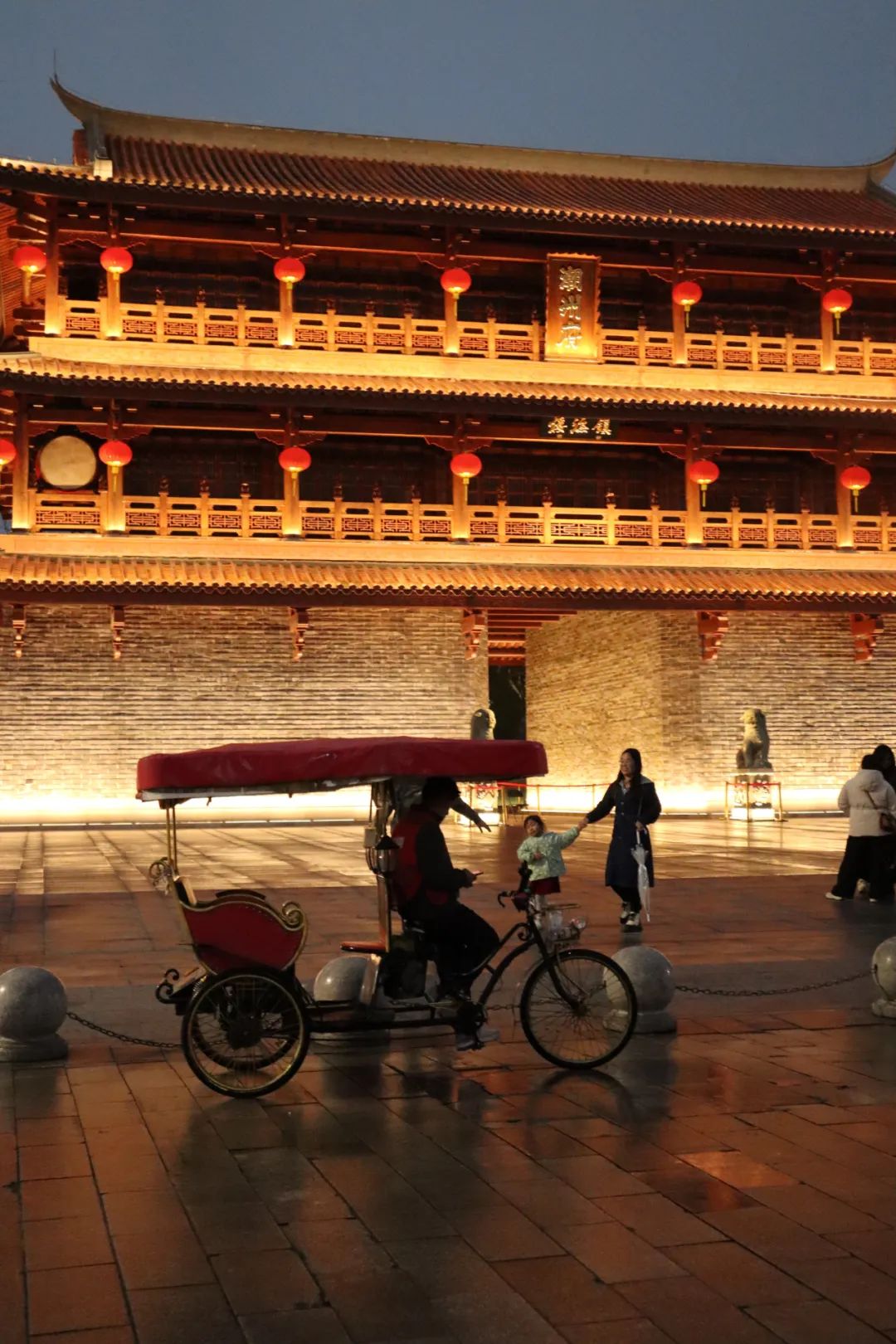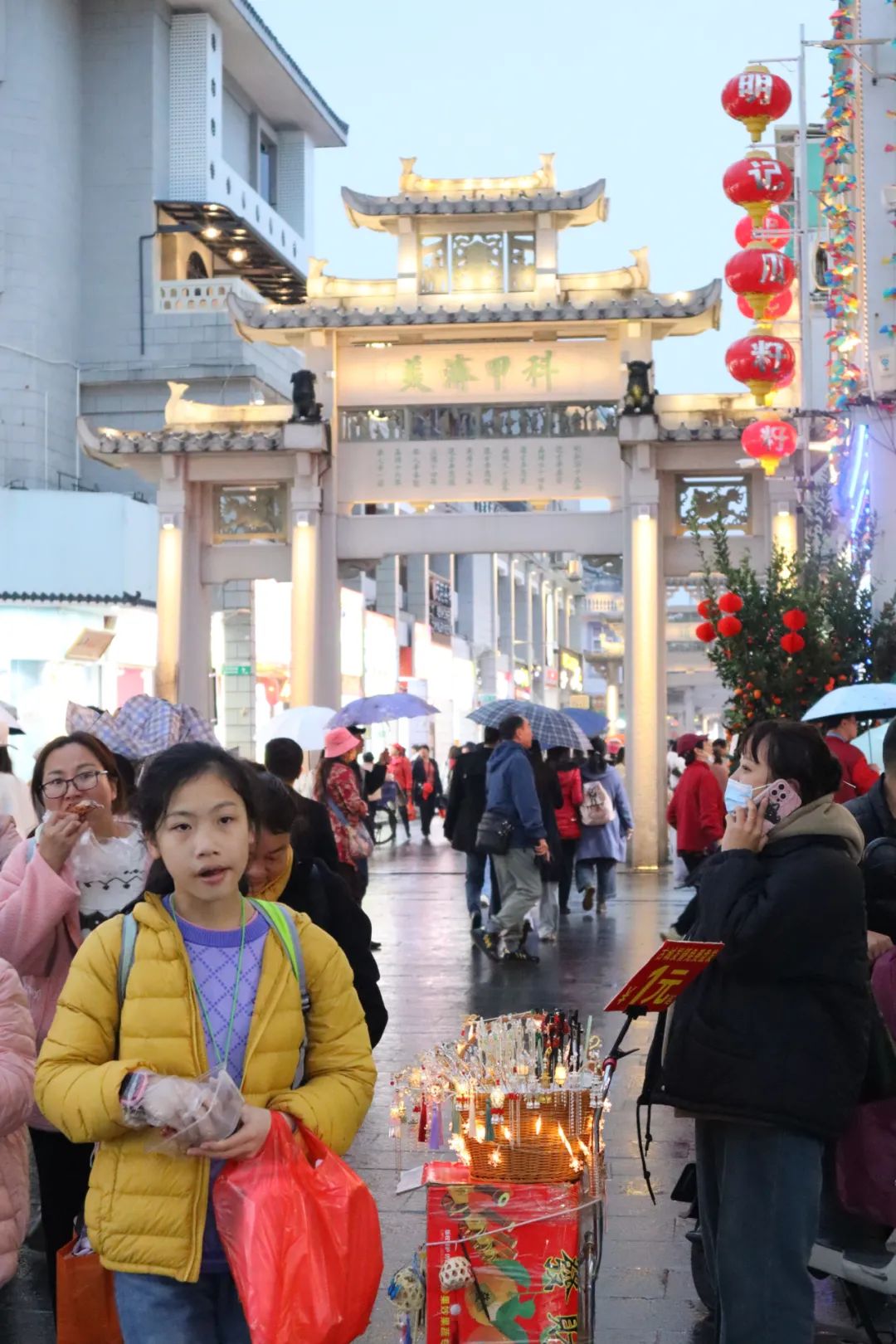 在牌坊街乱逛了几圈,拍了一些夜景照,夜景确实好看一点,还吃了一个特色小吃「糖葱薄饼」,最后考虑来都来了还是去看灯光秀吧!