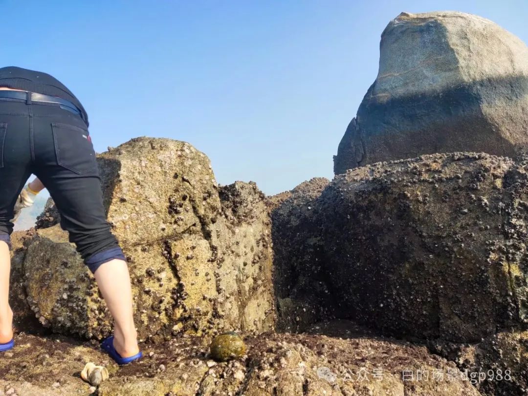 一边察看和惊叹着密布礁石的藤壶,一边在水洼缝隙里翻找,寄希望于侥幸,或能捡到贝类或是海参游鱼什么的,但终究是落空,只是不甘心地带回了几片贝壳。一个来自江西的三口之家已在海滩上逡巡了好长时间,那个女人见我路过,自来熟地向我兴奋地展示她们的成果,一只海参。海风似乎更大了,海水也赶走了几辆停在我前的车子,海波也将吻到我车子的前车轮了——我们该离开了。大体沿着平潭岛东面环岛公路一路向南,越过一个又一个的海湾,天气好,游人多,石头建的房子一直相伴左右。在一些高点的滩涂沙地上,种有成片林木,其间风力电塔随处可见,道路平直,车速很快,南国风情十足。在海湾处,往往则是游人如织,众车龟行,远远的海滩上众生欢娱。