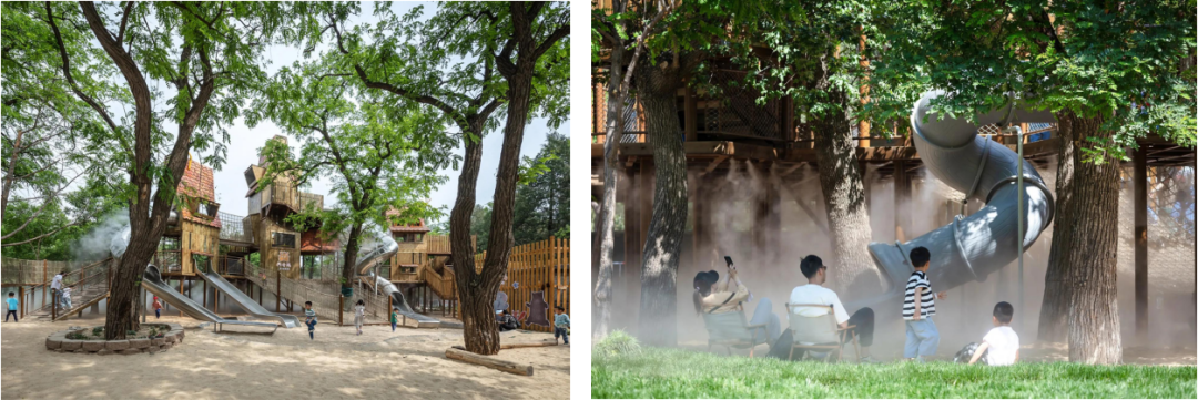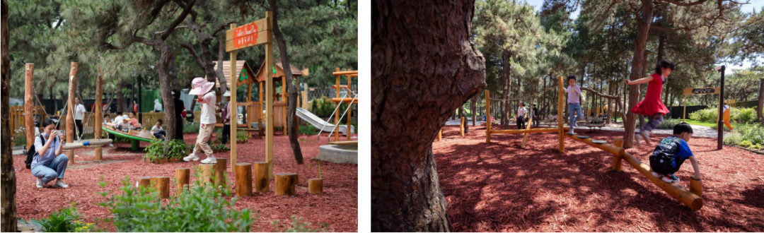 该项目充分利用原生自然环境,保留场地现状植物资源,保护生态多样性,维持基地生态平衡,现状高大乔木为林下活动的游客提供了天然遮荫,创造儿童与自然亲密接触的环境。
