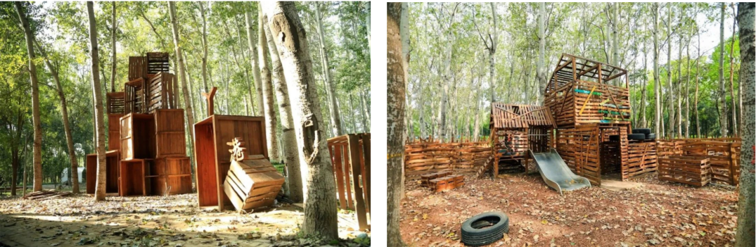 利用小木箱的摆放形成趣味门头,局部进行变化,为小木箱摆放增加层次感。它既是一处用木箱组成的乐园,又是一个没有固定路线的小小迷宫,孩子们可以在里边任意变换路线,在寻找出口的过程中还会遇到各种各样奇奇怪怪的任务:攀爬、滑梯、翻越、搭建、涂鸦、躲藏……