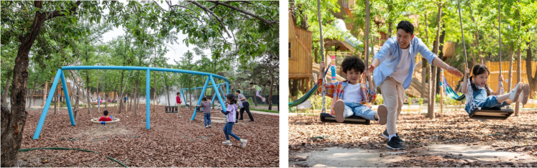 穿梭在林间的秋千完美保留了场地原生的银杏树生长空间,半弧形的设施环绕出内型空间,让人与人之间产生更多交互可能性,是社交休闲的热门场域。