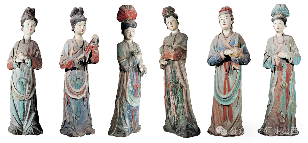 圣母殿珍贵,圣母殿里的43尊宋代彩塑更珍贵,堪称稀世瑰宝。大殿神龛内主像是圣母邑姜,她头戴凤冠,身披霞帔,端坐于凤头椅上。其余的四十二尊彩塑是宦官、女官和侍女,她们的姿势神态不一,做着各种各样的动作。塑像如真人大小,比例准确,姿态自然,是根据宋代宫廷“六尚制”塑造的。她们各有专职,身份、性格无一雷同,有负责饮食起居的,洒扫梳妆的,有负责奏乐歌舞的,年龄也各有不同,是“典型环境中的典型性格”。这些彩塑对于研究北宋宫廷“六尚制”和宋代宫廷生活、衣冠服饰以及宋代彩塑艺术都具有重要的历史、艺术和科学价值。