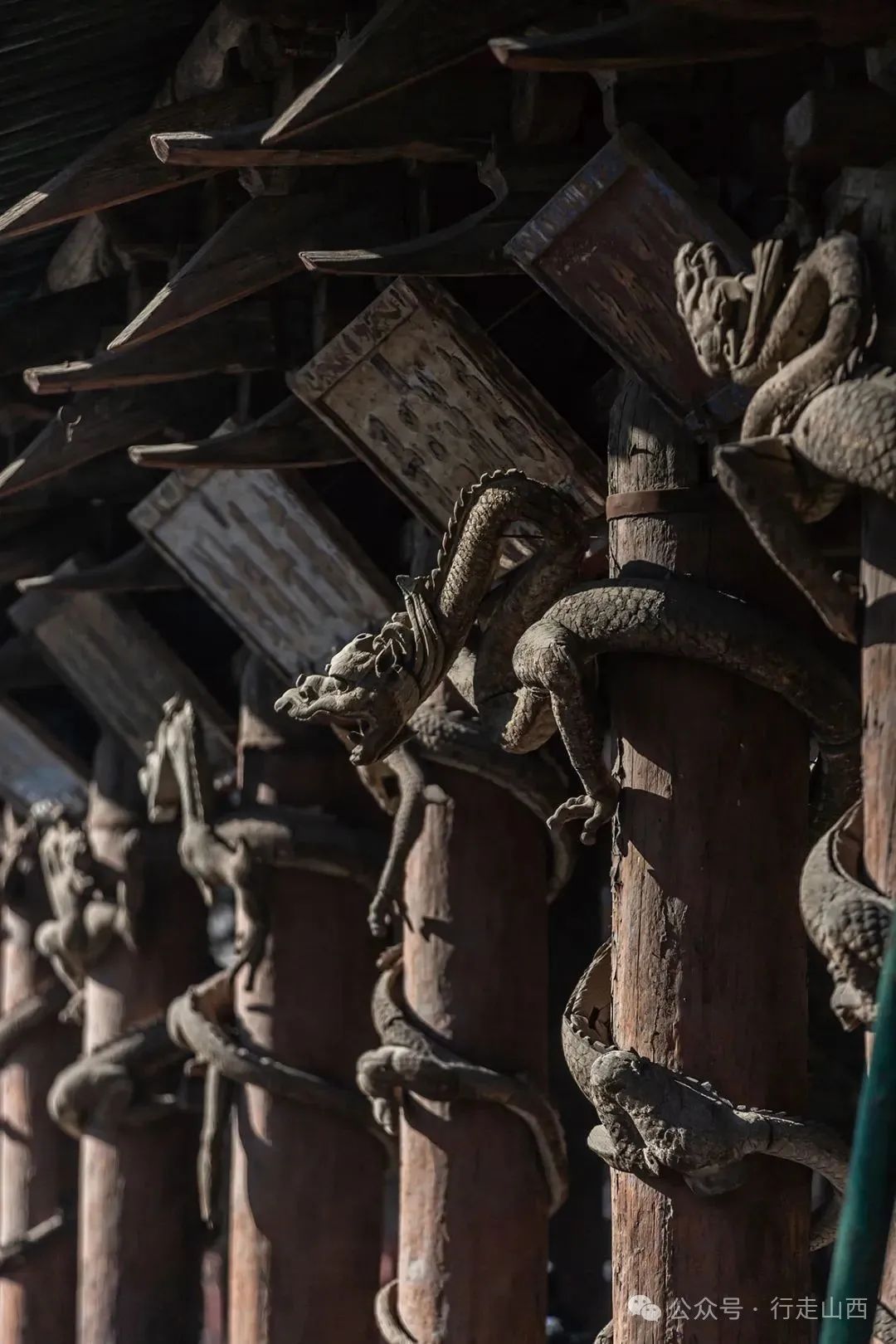 殿前檐柱上八条盘龙木雕,是宋时期古建筑中仅存实例,不仅弥补了宋代建筑中木龙雕刻的空白,也同样串起了民族信仰中龙形象的沿革历史。晋祠这组龙,不论是肢体还是雕刻形貌,都属孤品。
