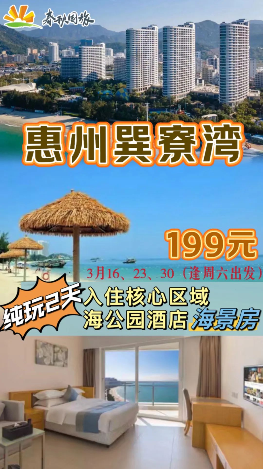 仅需199元跟团游二天,入住巽寮湾核心区域海景房,楼下即沙滩!