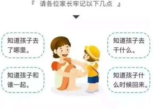 家长需要知道孩子去了哪里,跟谁在一起玩,知道孩子干什么去,知道孩子什么时候回来。提醒家长做好放学后、周末和节假日等离校时段的监护陪伴,全力做好冰面安全事故、幼儿溺水防范工作。