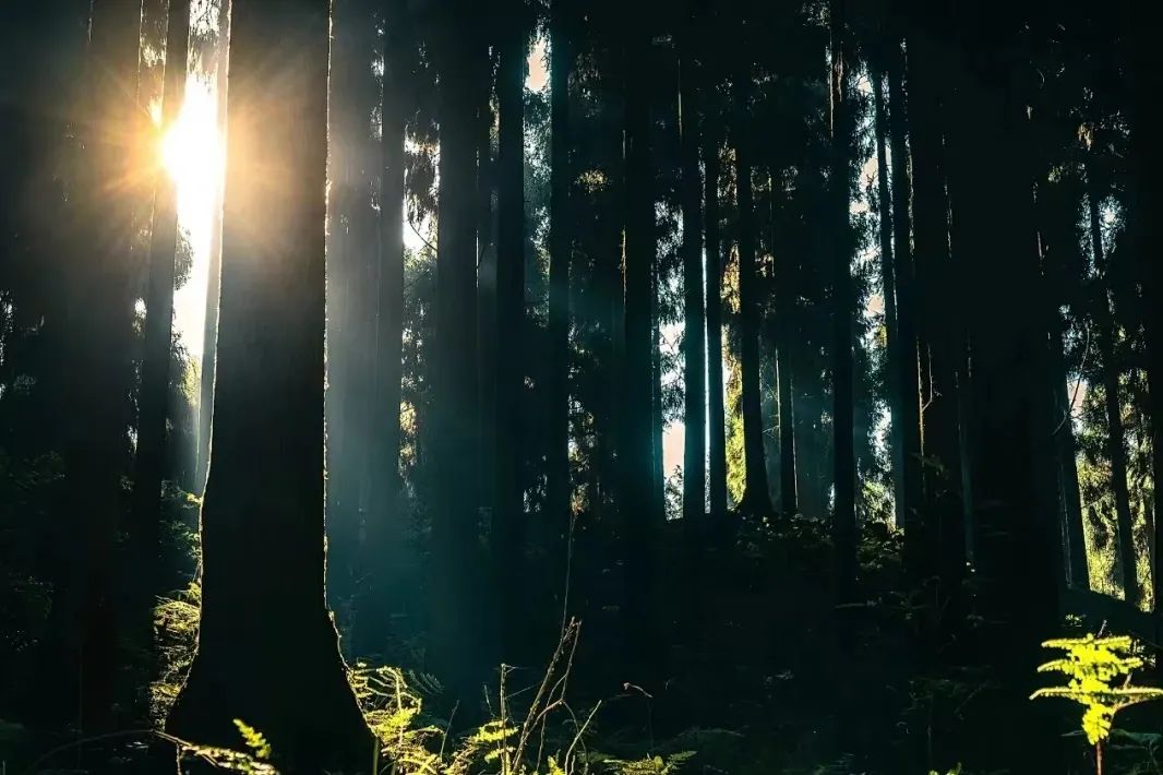 松树笔直高耸,郁郁葱葱,放眼望去,皆是触目惊心的绿。 密林中有一条长长的栈道,蜿蜒在这片森林里,成为了绿林中唯一的其他色彩。