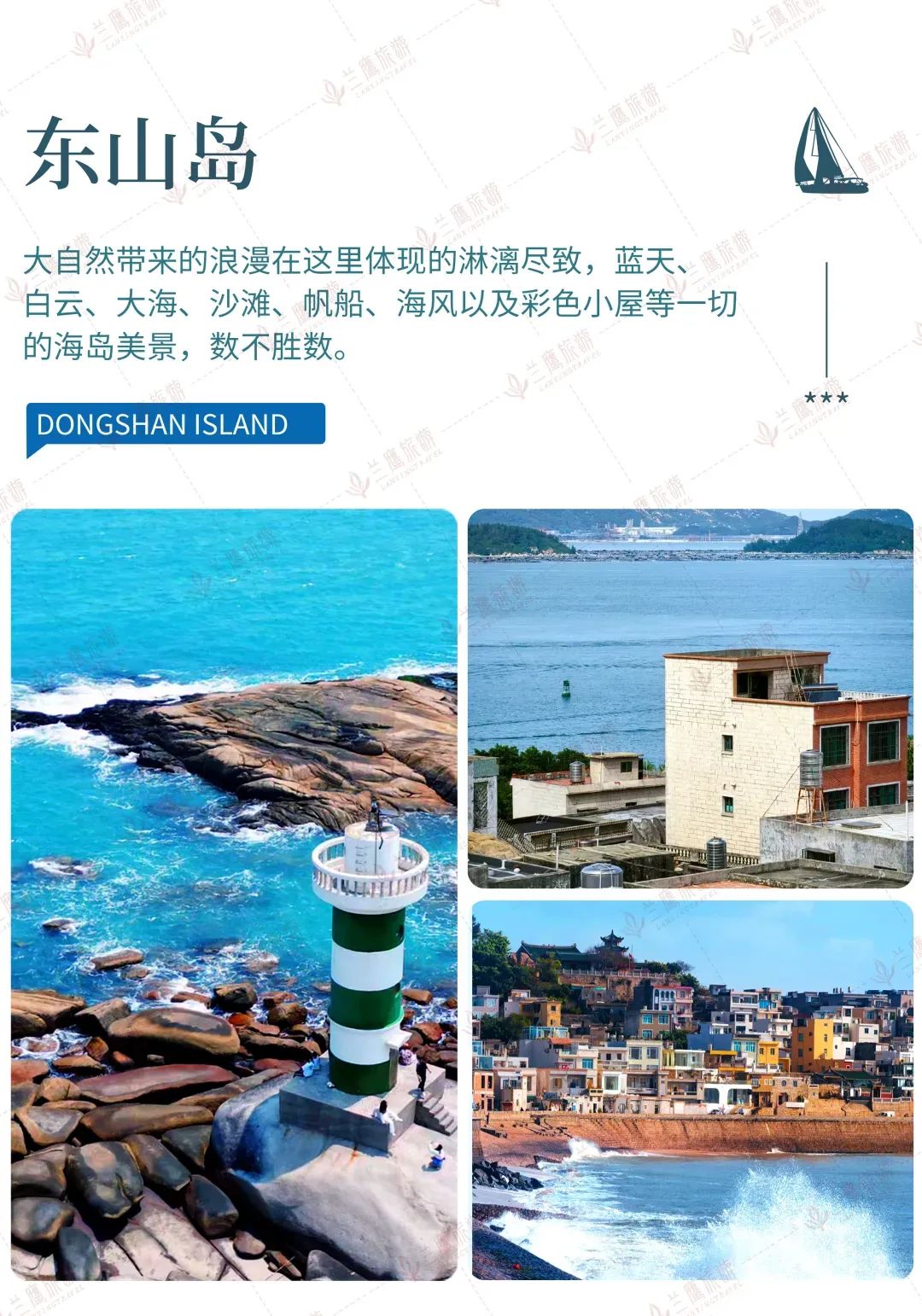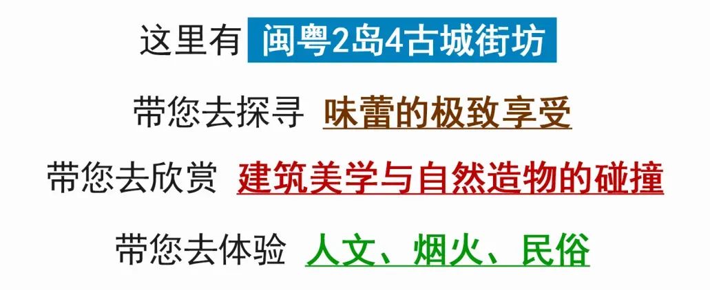 前往有国内最美海岛之美誉的【东山岛】:因电影《你的婚礼》《左耳》综艺《我们来了》而走进我们的视线,这里有蓝天、白云、大海、沙滩、帆船、海风以及彩色小屋等一切的海岛美景,数不胜数。多部大热申影的拍摄地【南门湾】在这里可以寻访东山地道的小吃,更可以去山顶的文公祠拜拜,据说很灵验的噢!