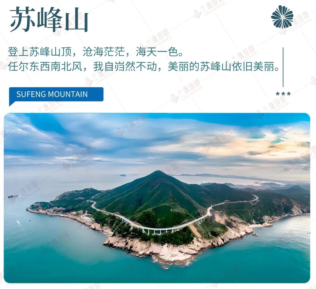 抵达【苏峰山】景区游览拍照,精选上帝视角,拍出大牌范。苏峰山峰奇洞异,其名虽俗而能穷形尽态,“水仙童噢”,说是有仙 童洗浴于此,泉水清澈甘甜,终年不涸。在凹陷的崖壁上还有三尊“石观音”,酷似石雕观音大士佛像,天然而逼肖,亦造物者之 杰作。此外还有“狮子望球”“北岛”“石龟”“犁头石”“沉水泉”“牛仔礁”“猪母礁”等,皆以象形得名。
