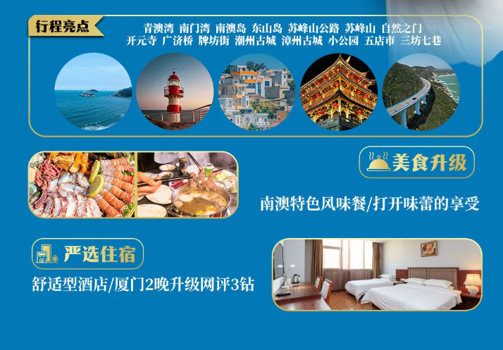 【万人游潮汕】¥1580起 双动/双高5日游|厦门升级2晚3钻住宿+东山岛/南澳岛/潮州古城/漳州古城/泉州古城一站打卡