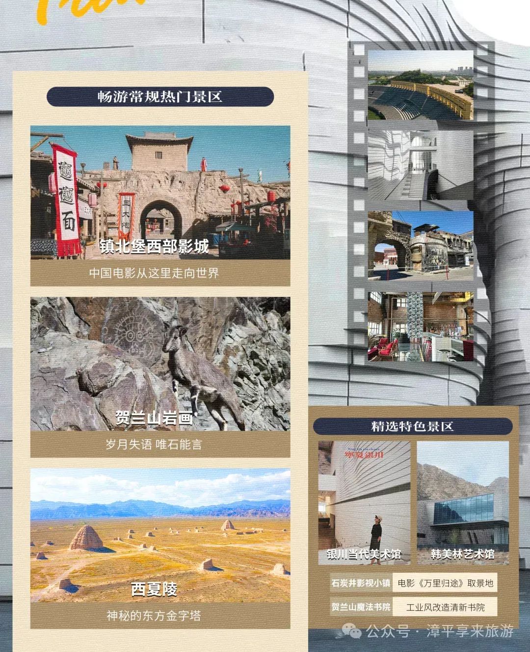 镇北堡西部影城/西夏陵/贺兰山岩画/五湖穿越/韩美林艺术馆/览山公园/当代美术馆/石炭井工业文旅小镇/看见贺兰演艺小镇/怀远夜市双飞5日跟团游