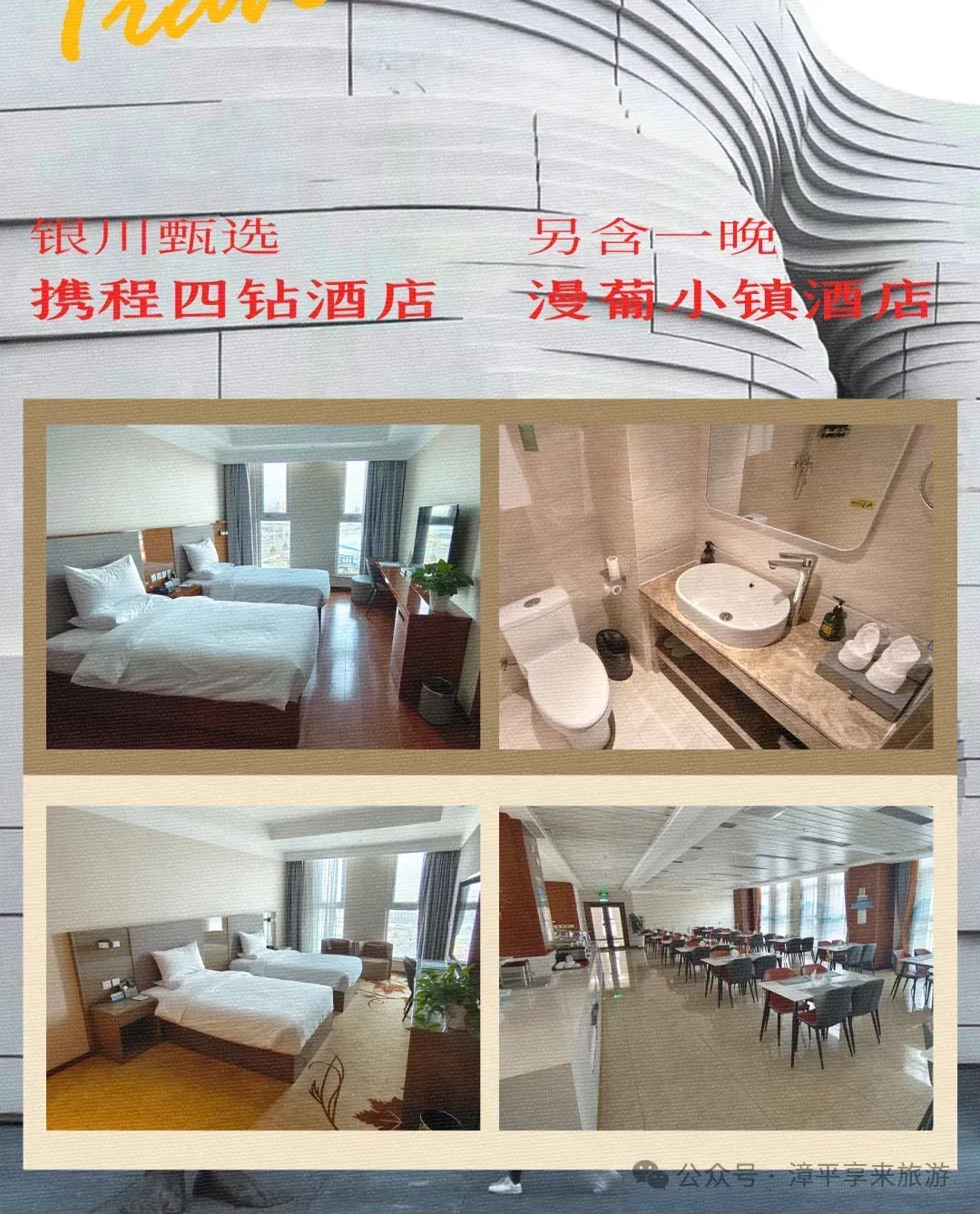 1【住宿】:全程3晚银川携程四钻酒店+1晚漫葡特色民宿(酒店不提供三人间及加床服务;如产生单男单女请补齐单房差以享用单人房间;以我社出发前通知客人入住的酒店为准)