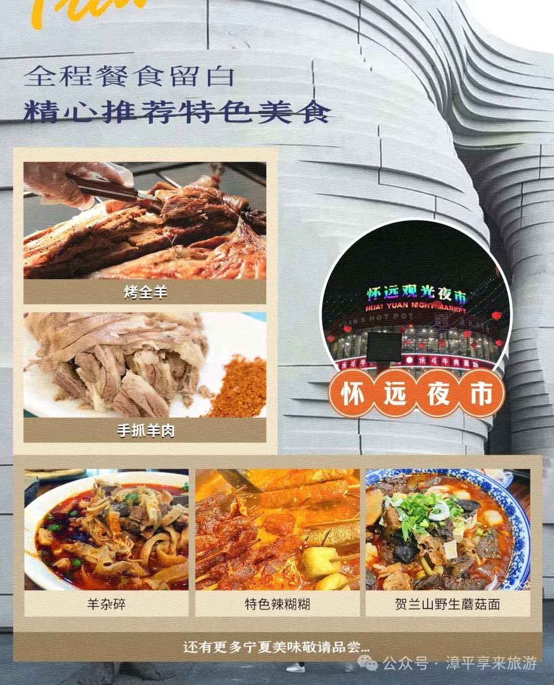 尊敬的贵宾您好,欢迎您来到美丽富饶的塞上江南“凤凰城”—银川市。这里地处祖国内陆,热情朴实的民风会感染您,这里的一切会让您感受到不一样的风情!我社将安排专人接站送您到市区入住酒店。市内半日自由行:上午航班的客人有足够时间进行银川半日自由行,舒服小睡以后,步行/打车/公交,参观城市名片—银川万达商场、银川鼓楼、玉皇阁、览山公园、新华步行街、中山公园、宁夏博物馆等。1、旅行管家在您抵达银川的前一天21点之前,以短信/电话方式通知您接团事宜、当地天气、注意事项等。请保持签合同时所留手机号码畅通并记住旅行管家专属电话。后期行程中有任何问题请在第一时间与旅行管家联系,旅行管家随时在您身边。2、不同航班30分钟以内同一辆车接/送飞机;不同车次30分钟以内同一辆车接/送火车/高铁。1、银川市区著名建筑及商圈推荐:鼓楼、玉皇阁、承天寺塔、海宝塔、新华街商圈、万达商圈、大阅城商圈。2、银川美食及夜市推荐:小叶手抓、德鼎逸品涮羊肉、红柳枝烤肉、宁大怀远夜市、大阅城观光夜市。