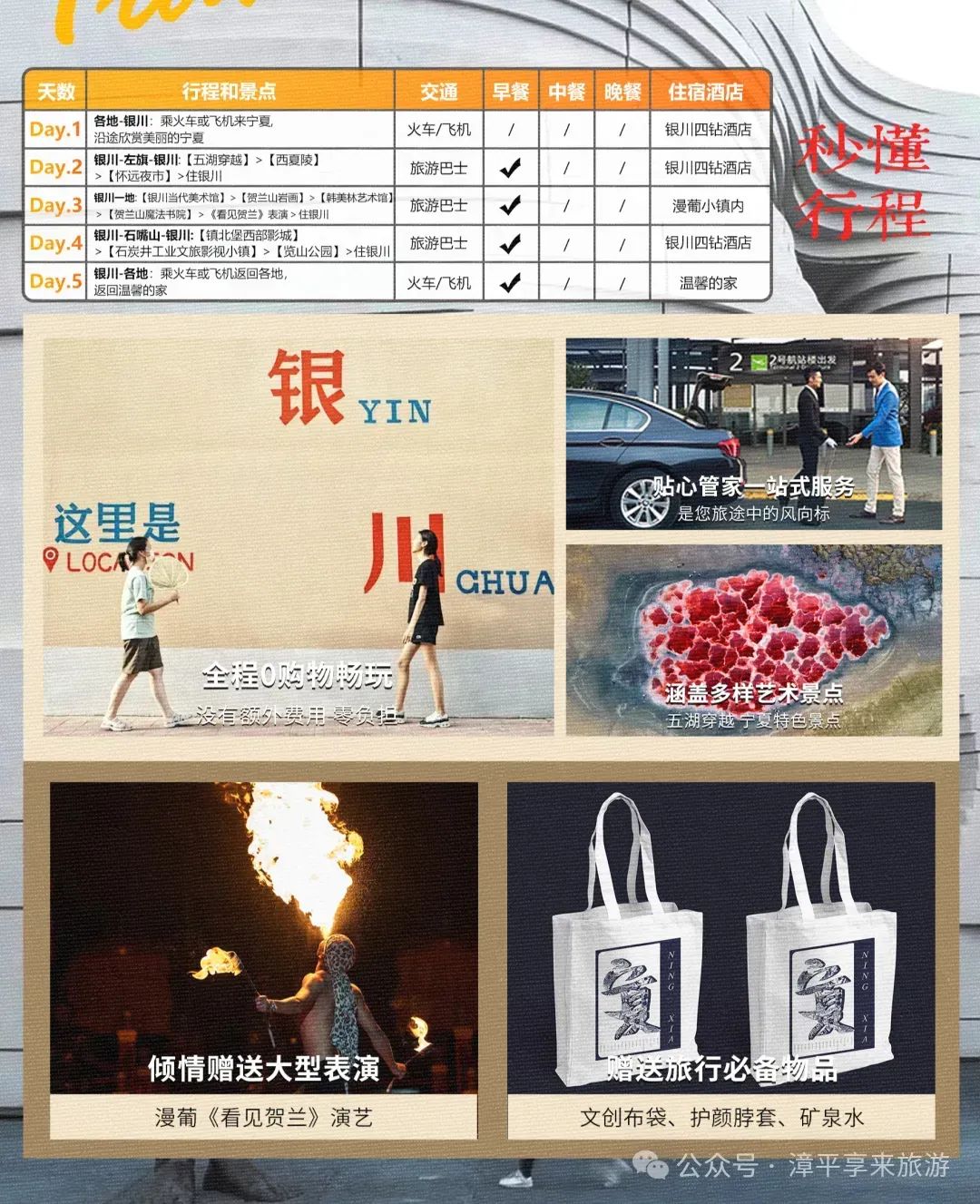 参考酒店:银川:美德亨大酒店/润泽华洋酒店/沙美假日酒店/长相忆酒店或同级漫葡小镇:望山居/葡萄酒店/影城酒店或同级酒店(漫葡小镇若无房,我社有权调至银川市区酒店)备注:银川为国家三线城市,酒店各项标准偏低,主要以卫生舒适为主,请您提前做好心理准备哦!2【用餐】:全程含4早,酒店含早。正餐自理,自由体验当地特色美食3【用车】:全程正规旅游车队安排空调旅游车,根据人数匹配车型,保证每人一正座。4【门票】:全程景点首道门票、西夏陵区间车、岩画电瓶车(本产品以按照旅行社优惠折扣核算门票,因此不再享受任何证件优惠)5【导游】:优秀中文导游服务;接送机无导游,备注:6人以下无导游,司机提供简单服务。6【购物】:纯玩无购物(旅行社在产品线路中不安排购物店,但行程中途经的很多场所,如景区、酒店、餐厅、机场、火车站等内部都设有购物性的商店,此类均不属于旅行社安排,我社对其商品质量无法担保,请慎重选择!)7【儿童】:12周岁1.2米以下:特价儿童机票,含车位费、导服、含早餐,不占床;不含门票费;如儿童超高无法免费入园及使用早餐须另增加相关费用。8【机票】:厦门—银川往返机票,含机建燃油,团队特价机票,出票后不受理退票、改签;机票具体航班时刻以开票通知为准!不能指定航班时刻,如需指定航班时刻请补足机票差价!1、旅游意外伤害保险及航空意外险(建议旅游者均购买)2、地面服务费:如机场接送等;行李物品保管费及托运行李超重费3、当地自费选择项目,景区内另行收费的小门票、电瓶车、小交通、索道等。4、当地所产生的个人消费(如:酒店内洗衣、理发、电话、传真、饮品、烟酒、备品损坏而产生的个人消费)7、自由活动期间的餐食费及交通费;行程之外的观光项目。1、行程所含赠送景点,因不可抗力或外界因素造成无法游览,不产生任何增减费用。2、全程使用空调旅游车,每人一个正座位,提供优秀司机兼导游服务。3、由于旅行社组织的是散客拼团线路,未成年人须有成人陪伴出游,残疾人、老年人、行动不便者建议有家朋友照顾同行,体弱多病及孕妇、70岁以上长着不建议参团,否则由此造成的不便或问题,我社不承担责任。4、当地酒店标准比内地偏低,请旅游者提前做好心理准备。如遇旺季(每年3月1日至10月15日之间及特殊节假日)酒店资源紧张或政府临时征用等特殊情况,造成行程中备选酒店客满,我社有权调整为同等级标准。5、酒店退房时间为中午的12:00,返程为晚班机的旅游者可把行李寄存在酒店前台后自由活动或自补房差开钟6、行程中所含的餐食,早餐为酒店房含,不用不退。正餐按产品用餐标准操作,不含酒水。7、行程所含门票指进入景区的首道门票及必要交通,不包括景区内其他另行付费景点门票。如遇人力不可抗拒因素或政策性调整导致无法游览的景点,我社有权取消或更换为其它等价景点,赠送景点费用不退,并有权将景点及住宿顺序做相应调整;景区后括号内备注游玩时间为抵达景区开始到离开景区为止时间。8、本行程为不进不加行程,其中部分景区及酒店为方便旅游者有自设的商场及购物场所,并非我社安排的旅购物店,此类投诉我社无法受理,敬请谅解;如在自由活动期间有购物需求,请自行前往;当地购物时请慎重考虑,把握好质量与价格,务必索要发票。9、请如实填写当地《游客意见书》,游客的投诉诉求以在宁夏当地、旅游者自行填写的意见单为主要依据。不填或虚填填写,归来后的投诉将无法受理,如在行程进行中对旅行社的服务标准有异议,请在宁夏当地解决,如旅游期间在当地解决不了,应在当地备案。温馨提醒:旅游投诉时效为返回出发地起30天内有效。注意事项