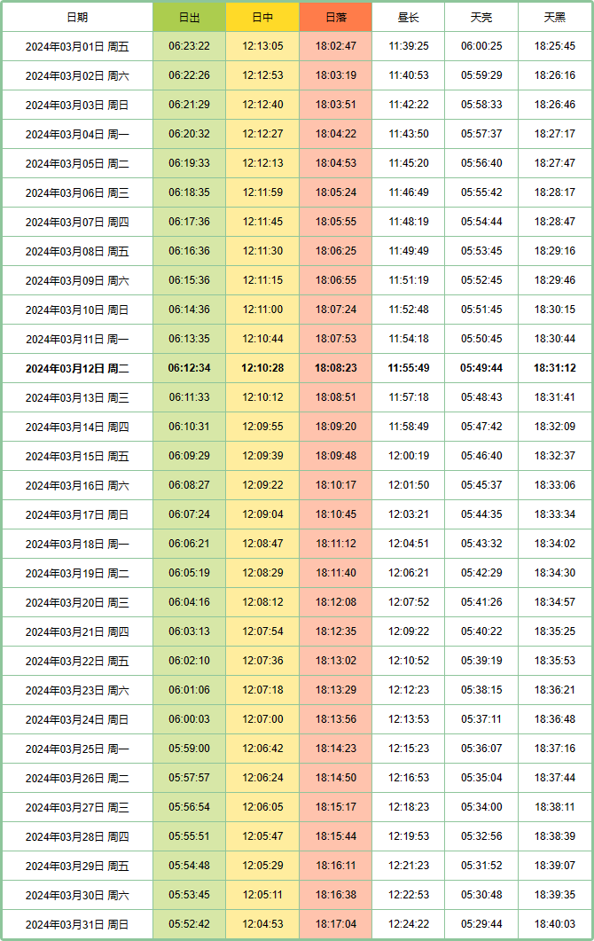 五日出日落时刻表