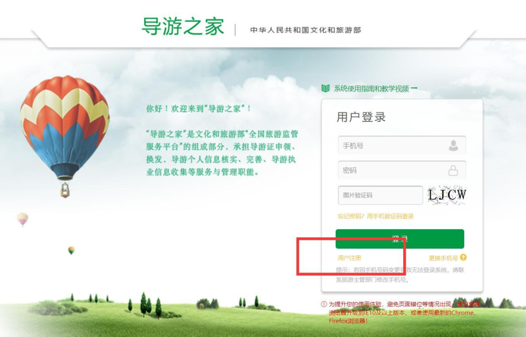 点击【用户注册】按钮,进入【用户注册】页面,输入导游手机号码、图形码、短信验证码、密码等信息后,点击【注册】按钮。