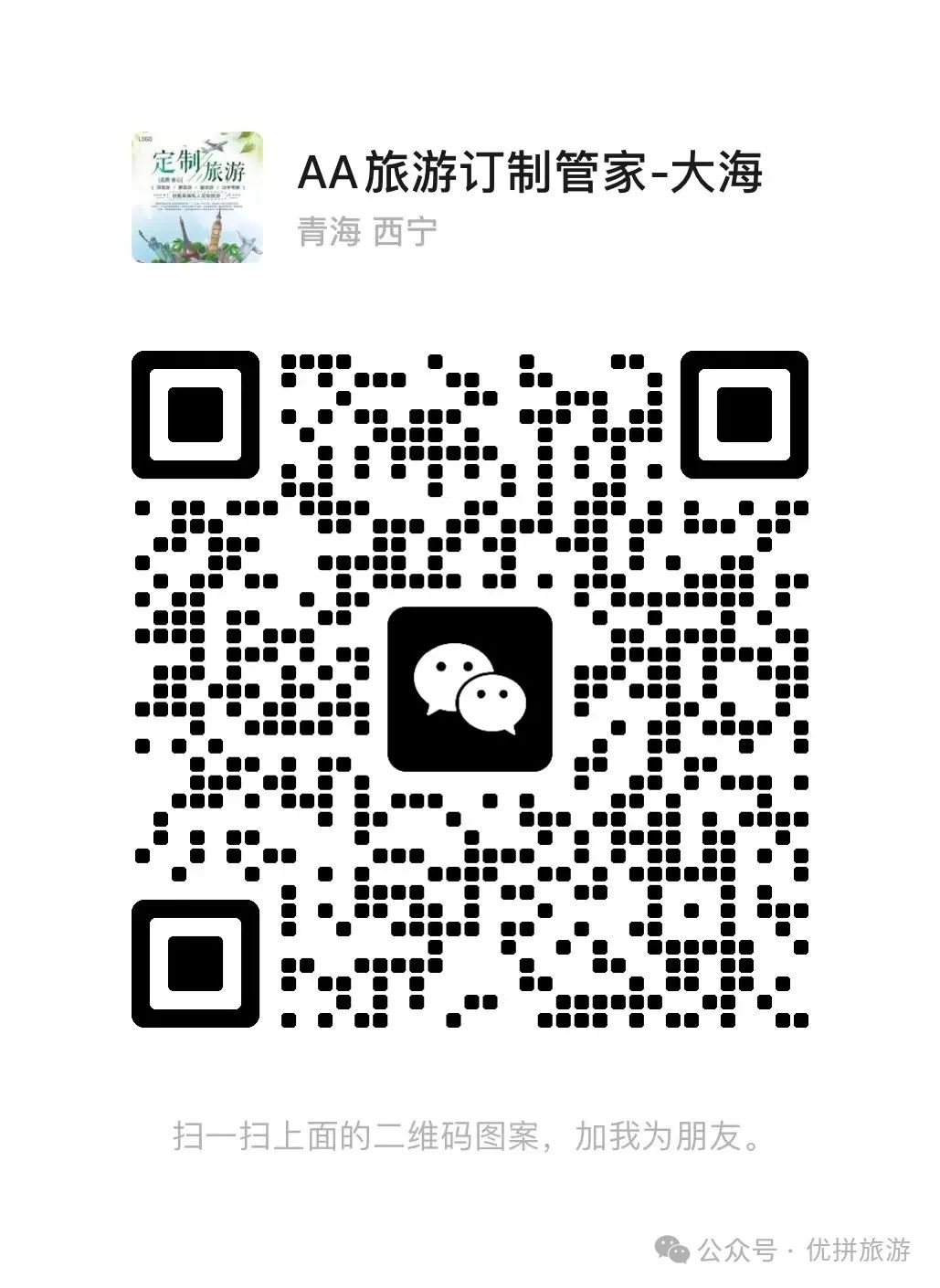 本人是旅游规划师大海,西宁大学旅游管理专业,毕业十年,专注于大西北旅游线路,制定个性化的服务和专业的建议。我将充分了解你的兴趣和需求,在行程规划中考虑到各项细节,包括交通、住宿、餐饮和费用预算等,确保你在旅行过程中省心又省钱。本人只做高品质纯玩团【主打回头客介绍】诚信经营,良心做事,用旅行传递文化,用文化传递正能量!让旅游回归旅游!