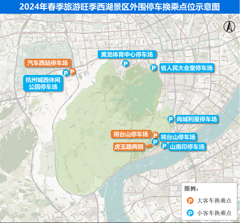 (2) “小客车+公交”换乘。在黄龙体育中心停车场、省人民大会堂停车场、杭州城西休闲公园停车场、山南印停车场、将台山停车场、尚城利星停车场等6处停车场提供停车换乘和公交接驳服务,市民、游客可换乘公交专线直达西湖景区。