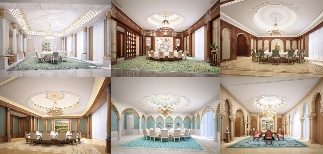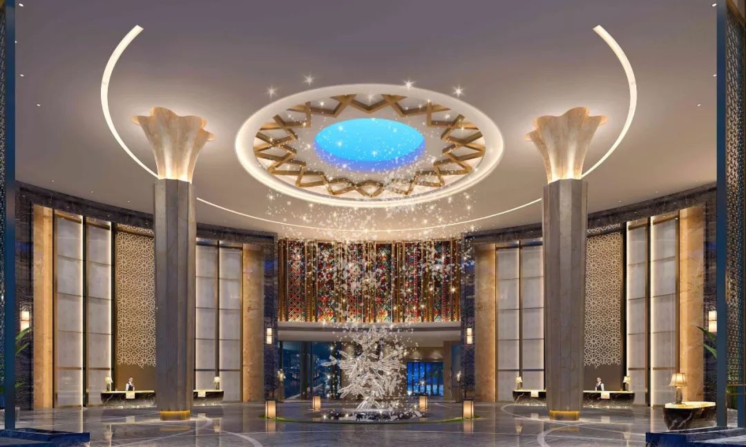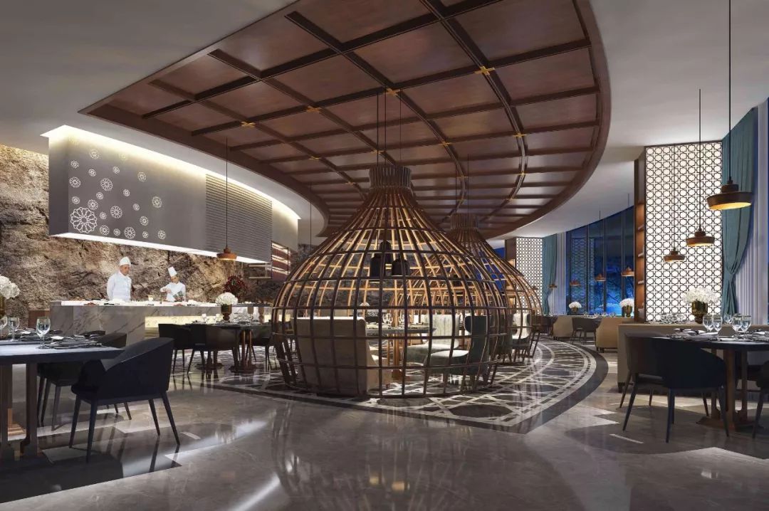 在餐厅设计上,酒店也花了不少心思。上合组织各成员国文化主题厅内含八国主题,各具特色,景泰蓝与灯光交相辉映,仿佛贯穿在“一带一路”。