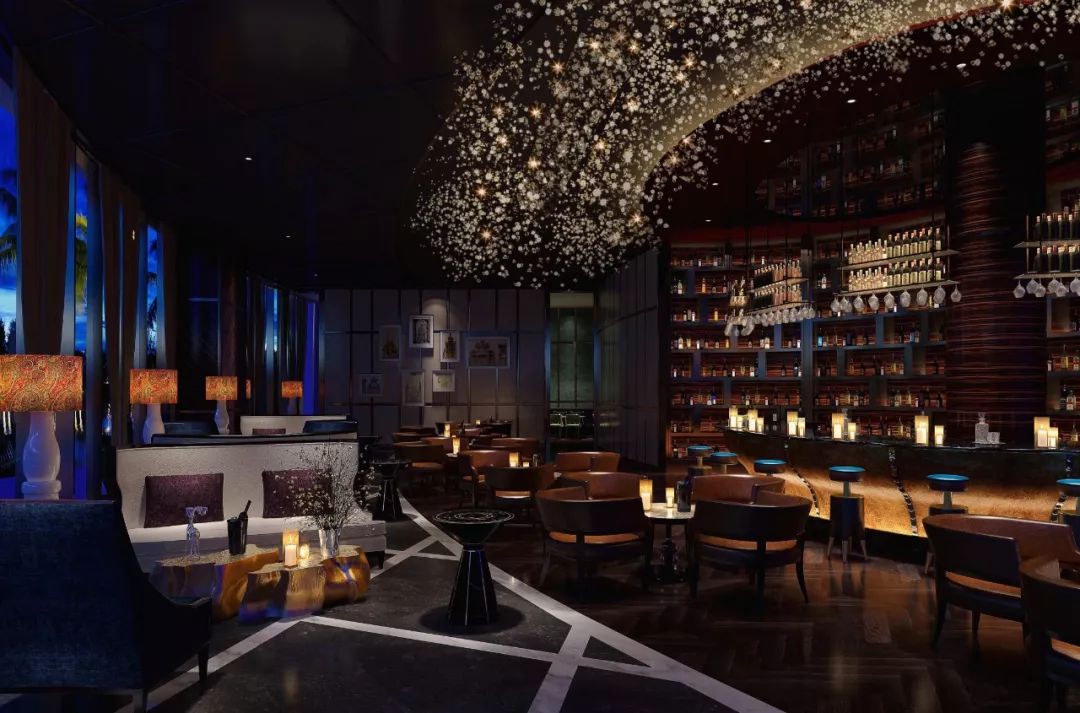 酒店的金月湾吧也很受欢迎,略带复古的设计仿佛带我穿越到80年底的欧洲,灯饰更是布在吧台之上化作星空,这里像一个不真实的梦境,所有人来到这里都能借着微醺,卸下面具,将烦恼疲惫抛之脑后,只做真实的自己。