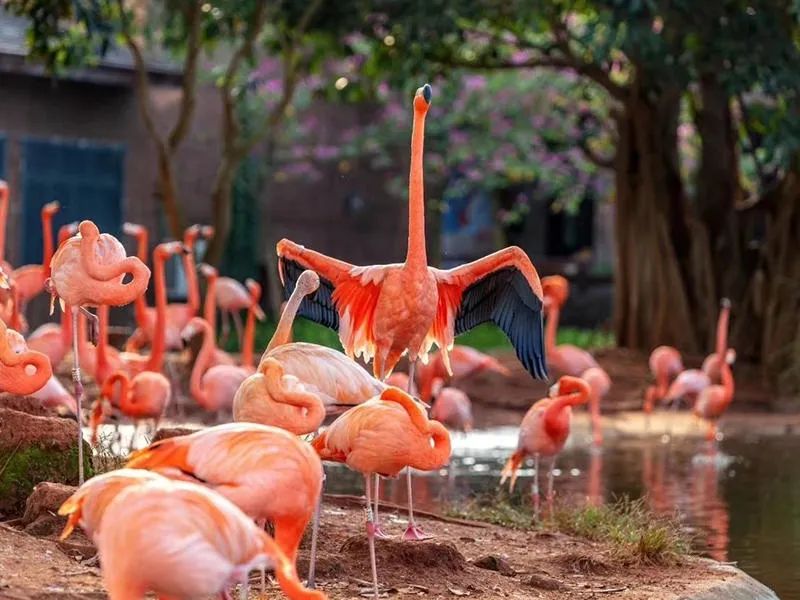 晃一圈下来,你会发现这里能看到不少动物。看这火烈鸟,生活得悠然自得、毛色鲜亮~
