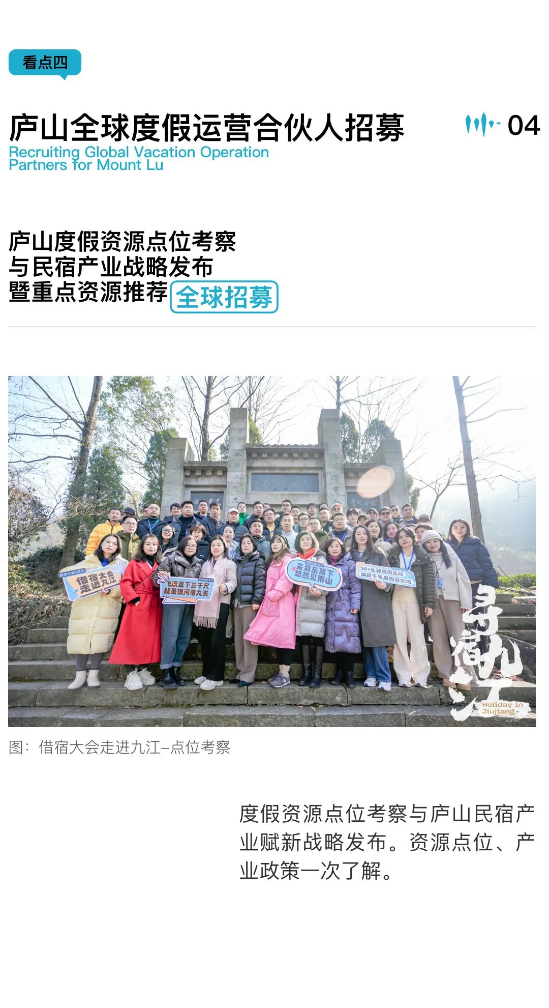 2024年第一站在江西九江庐山,我们以「赋新」为主题,邀约了数百家全国度假品牌代表、行业投资人与两岸度假行业领军人等齐聚庐山,一起探寻散落在庐山的未来度假目的地,为赋新庐山找到有效途径。