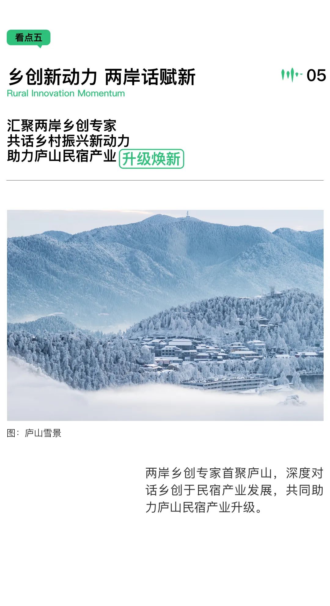 我们将通过打造“庐山样本”,一起借助“民宿+”的创新方法,为庐山高品质旅游目的地的发展激发动力,推动庐山全域旅游品牌形象升级,走向“赋新”之路。