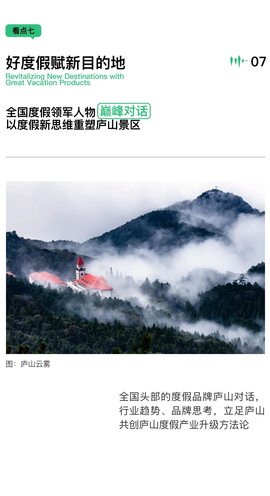 这将是一场全国性的度假行业大会,我们邀请了两岸头部度假品牌代表共赴庐山,为庐山打造成为世界级度假目的地提供切实的经验与创造性的想法。