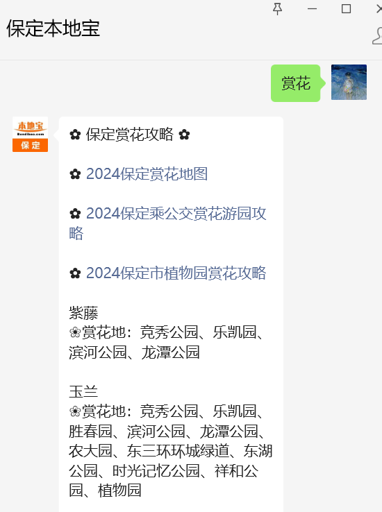 温馨提示:点击下方卡片关注【保定本地宝】微信公众号,在聊天消息对话框回复【赏花】即可获取保定赏花地图、攻略推荐等信息!
