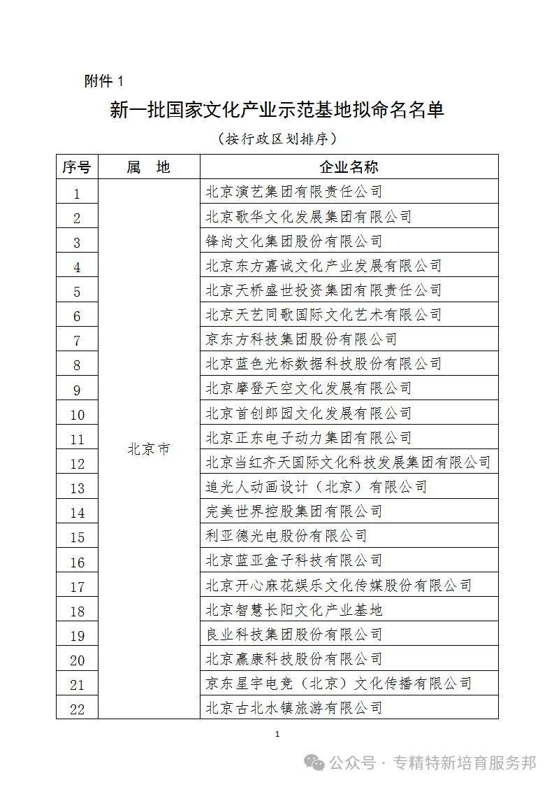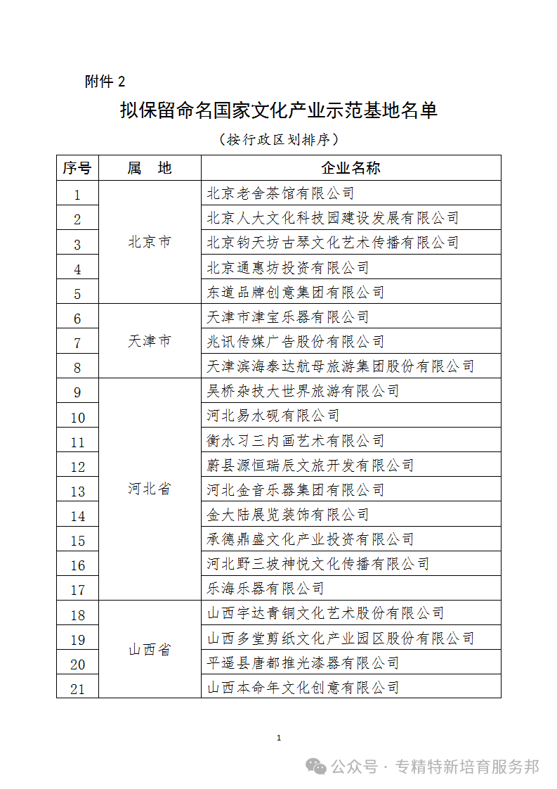 根据《国家级文化产业示范园区(基地)管理办法》和《文化和旅游部办公厅关于开展2023年国家文化产业示范基地申报与复核工作的通知》(办产业发〔2023〕90号),经评审,现将新一批国家文化产业示范基地拟命名名单、拟保留命名国家文化产业示范基地名单予以公示(附后)。
