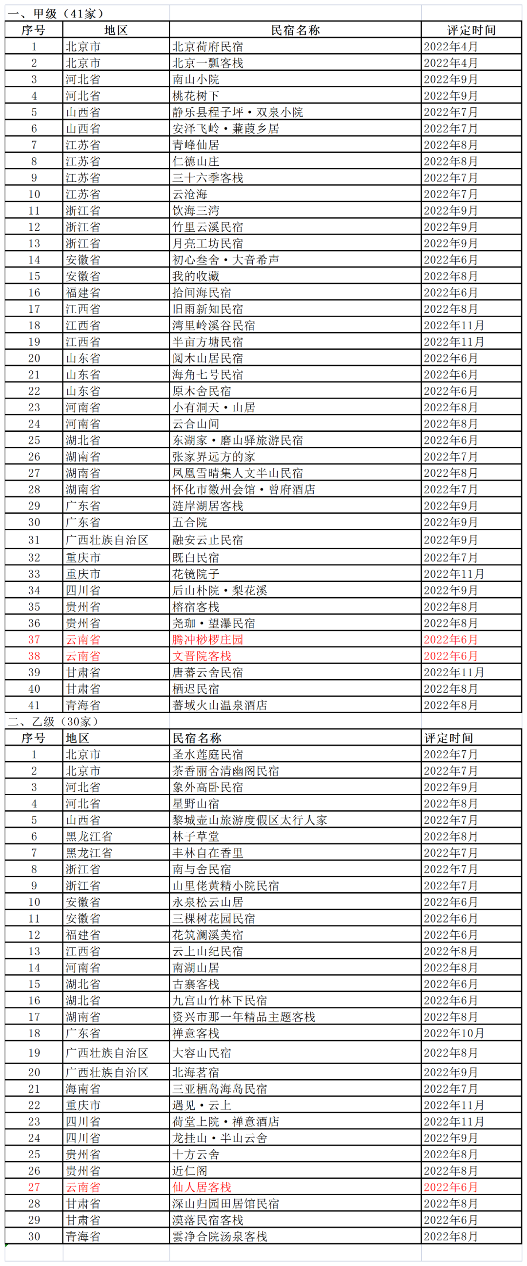 2022年全国甲级、乙级旅游民宿