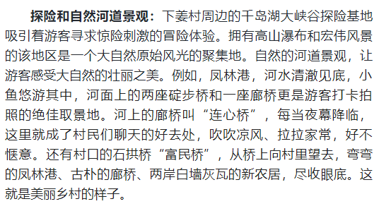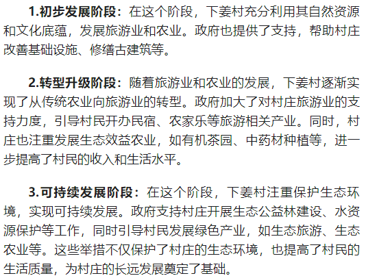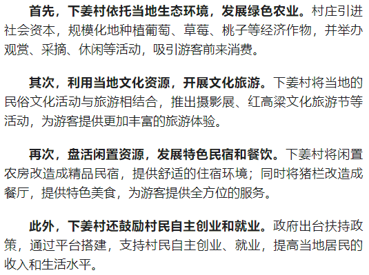 通过以上措施的实施,下姜村实现了乡村旅游的快速发展,带动了村庄经济的增长和村民生活水平的提高。同时,也展现了“绿水青山就是金山银山”理念的发展成果,为其他地区提供了可复制、可推广的乡村振兴之路。