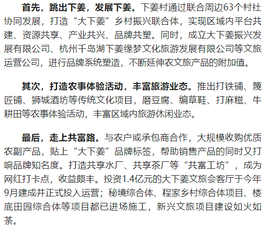 2.创新发展模式和合作共赢的理念。下姜村在发展过程中采用了“先富带后富、区域共同富”的可持续发展模式,通过与周边村庄的协同发展,实现了共同富裕。这种合作共赢的理念,不仅促进了乡村经济的发展,也增强了乡村社会的凝聚力和稳定性。这对于我国许多乡村来说,具有重要的借鉴意义。