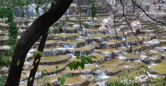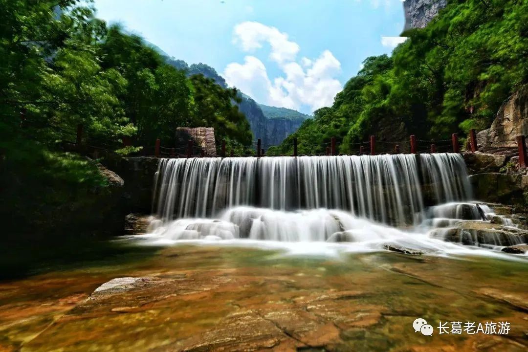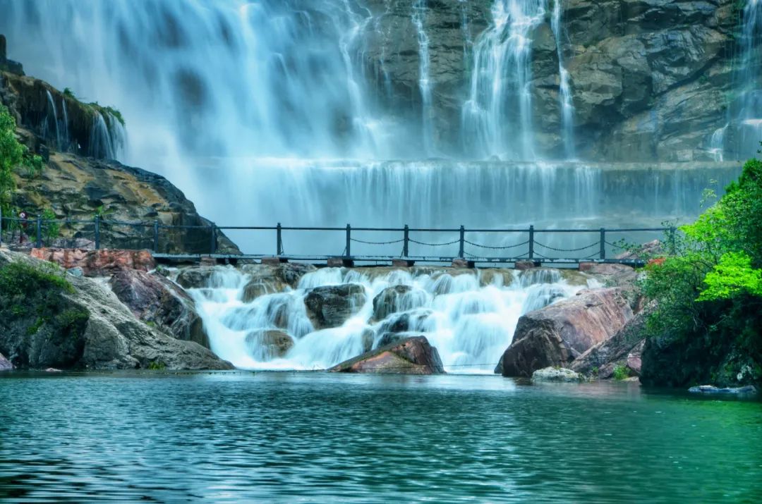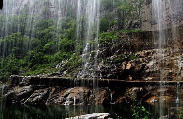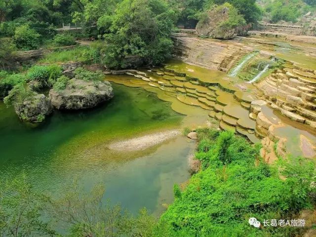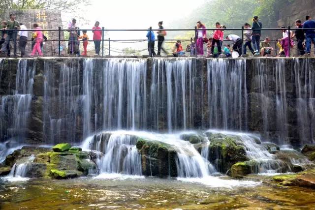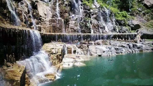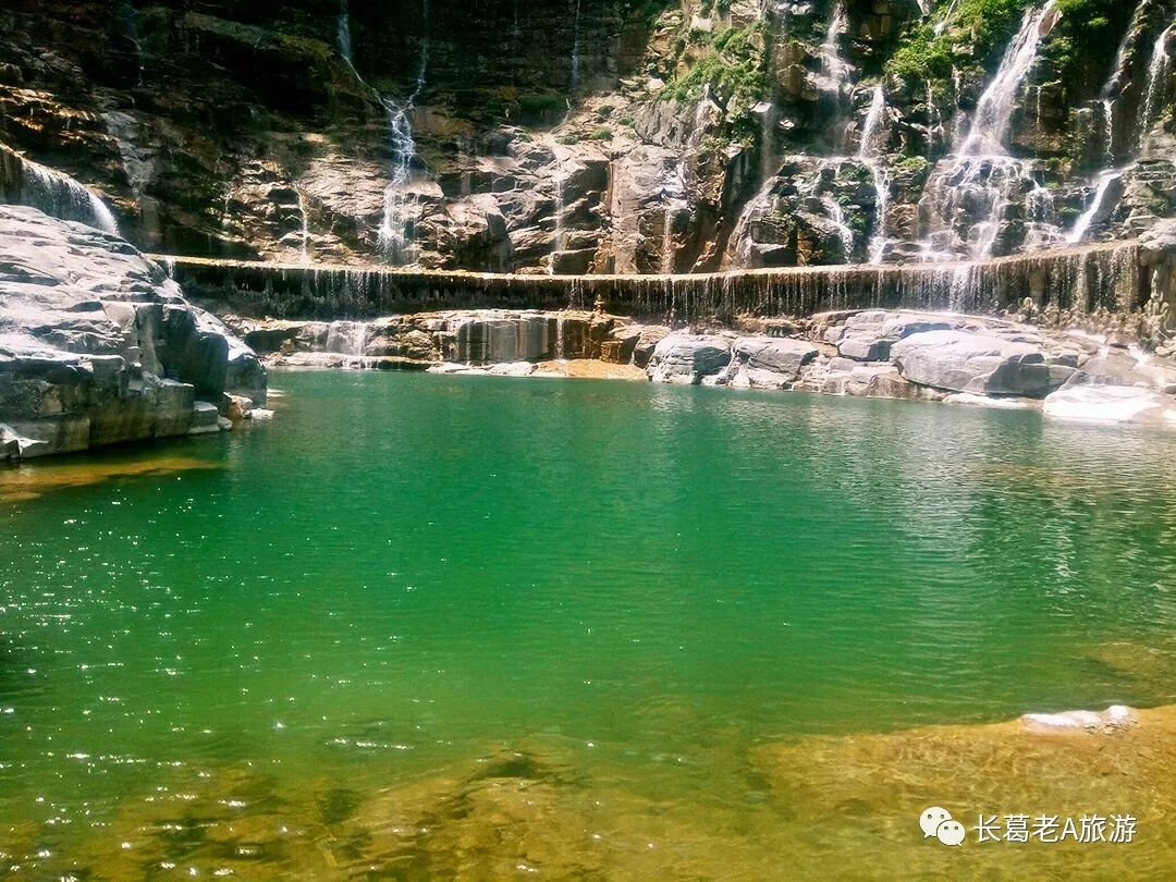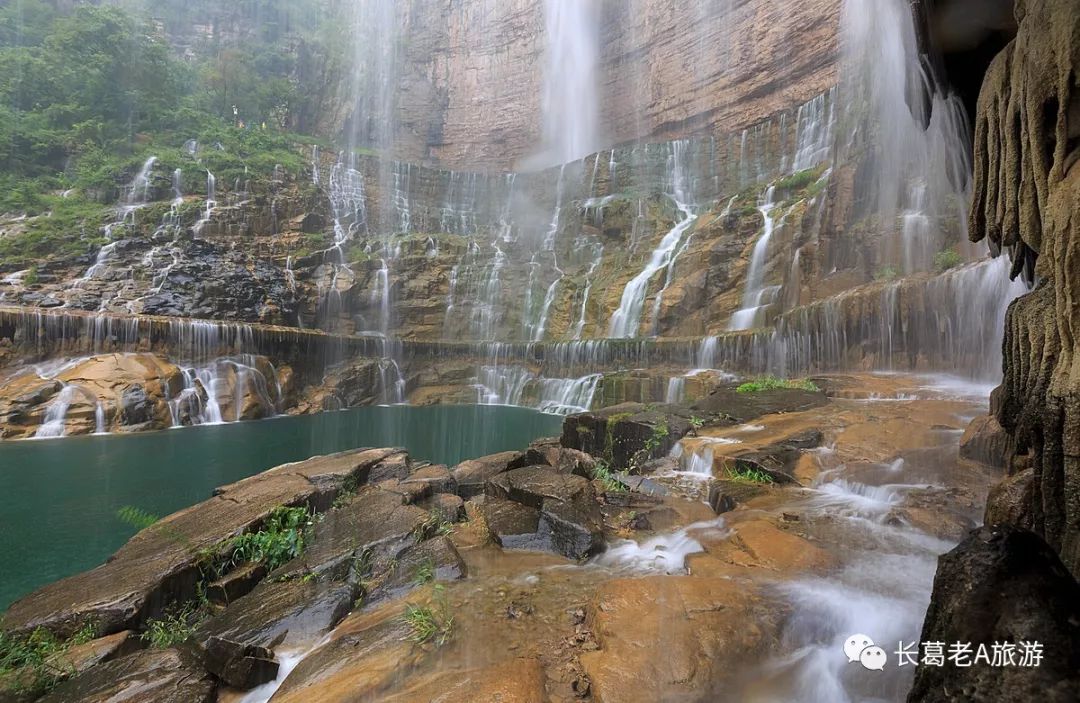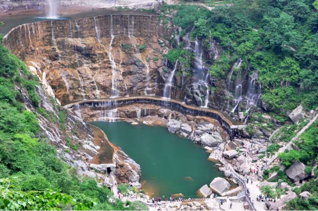 八里沟北方水世界,中原最大的瀑布观景群,这里的瀑布由一排排的小瀑布叠加而成,增加了几分宽度,恢宏磅礴的气质丝毫不减。瀑布下方汇聚成了众多潭水,潭水很多,你可以称之为湖泊,只不过这里的湖泊下方是瀑布,更像是一个整体,只是被硕大的石头切割开来,站在山脚下往下俯瞰,一条瀑布上面还是瀑布,灵秀翠绿的山峰半掩其中,颇有一种雄伟壮观的气质。