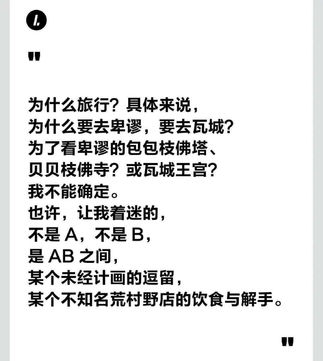 为什么旅行?具体来说,为什么要去卑谬,要去瓦城?为了看卑谬的包包枝佛塔、贝贝枝佛寺?或瓦城王宫?我不能确定。也许,让我着迷的,不是A,不是B,是AB之间,某个未经计画的逗留,某个不知名荒村野店的饮食与解手。