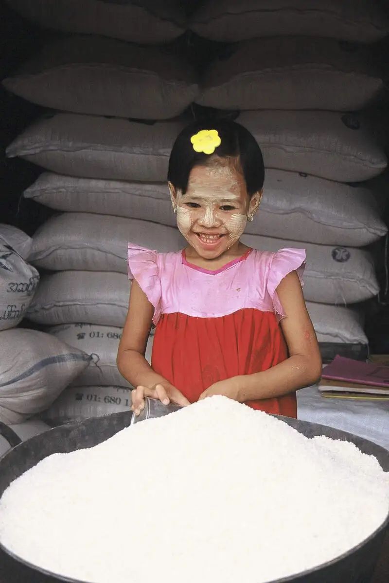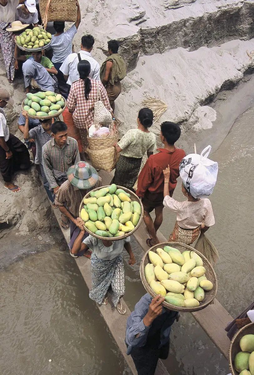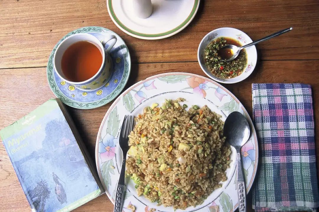 八点不到,在一不知名地方停车吃饭,荒村野店,油灯扑闪,人影错杂。我向脸上涂满白粉的女店家要了素菜米饭,端上来的却是四只银色小碗:一碗拌菜,有黄瓜、秋葵荚和两种薄荷叶;又一碗凉拌菜,半腌过的油渍通心菜拌花椰菜、鹰嘴豆和某种瓜;一碗汤,汤里也是那种不知名的瓜;最后是一碗鲜芒果配米饭,合五百缅币。