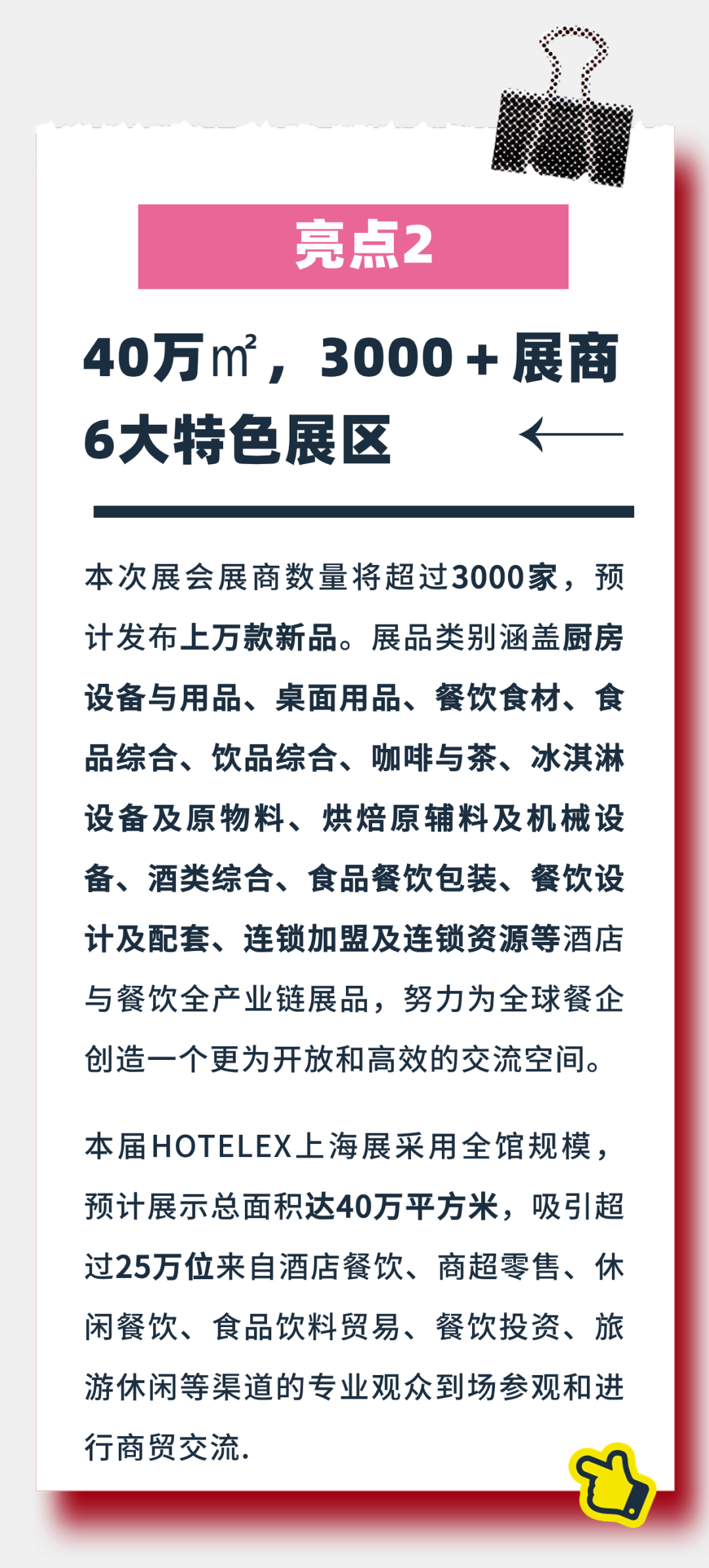 展会上,酒店品牌投资及加盟专区暨Hotel Plus酒店样板房品鉴:洲际、万达、华住(城际、桔子、桔子水晶)、云隐东方、达程酒店集团、上海隐居、万澳、锦和、弘峰、喜瑞达等酒店品牌展出;华住易购专馆:惠达卫浴、布朗卓艺、尚国瓷砖、美乐森等;非标住宿采购平台:互集文旅、iMBOX、暴风石、广茂、海市蜃楼、嗨轻野文旅、微宿VESSEL、全景视界、灵汇精晶、景栖建筑等“大咖级”休闲度假品牌展出;文旅内容展区;设计问诊室;摩登时尚设计周——好眠时代;电竞酒店特展;智慧酒店及整体解决方案主题展机器人专区;环卫技术与设备展区、智慧清洁特色展区将引领相关趋势发展。