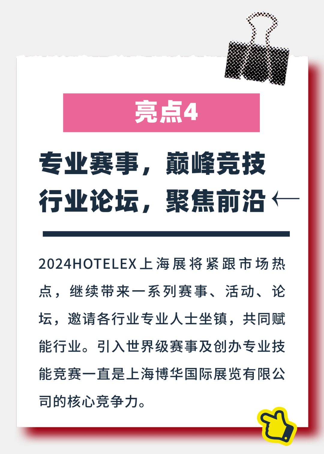 10+专业赛事火热来袭!@来自咖啡、烘焙、烹饪、潮饮、调酒、巧克力、摆台等行业的高手们将齐聚2024HOTELEX上海展现场,带来一场场充满创意和激情的对决。在此,不仅能欣赏到选手的精彩比拼,更将一览行业的前沿技术与产品,发现无限创意与灵感!