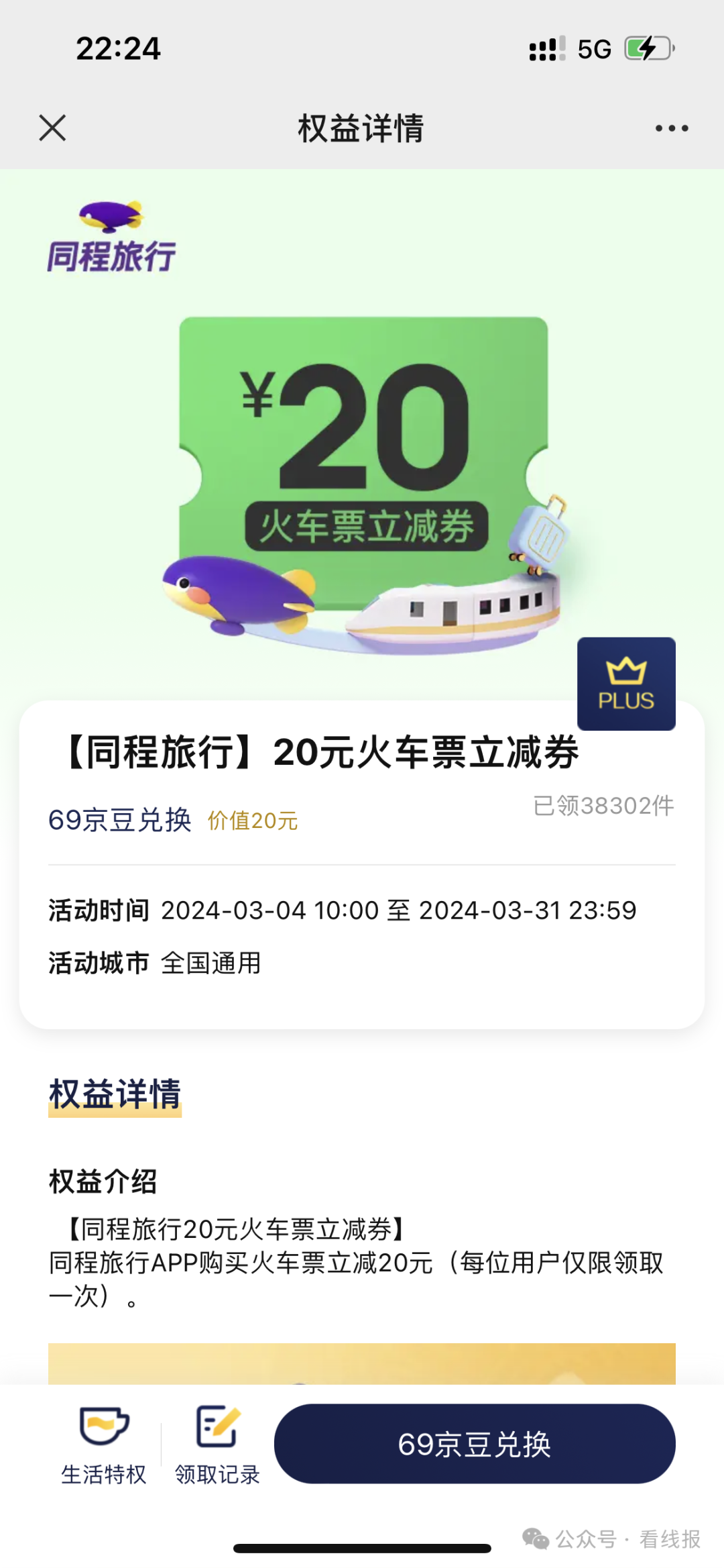 京东69个京豆可以兑换,兑换后获得兑换码需要到同程旅行app——底部我的——红包优惠券中兑换,兑换后记得查看一下有效期,每人可以兑换1次,活动截止到3月31日。