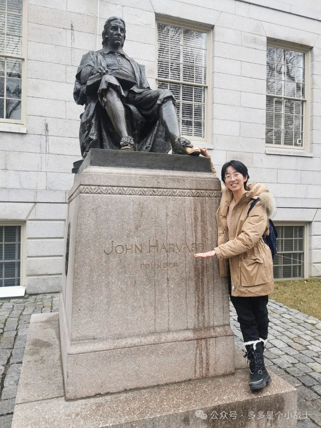 就在地铁站对面。似乎哈佛和 MIT 都是开放式大学,我们找了半天,硬是没找到一个气派的大门,能让我们拍照打卡。据说,摸了JOHN的脚,能带来好的考运。