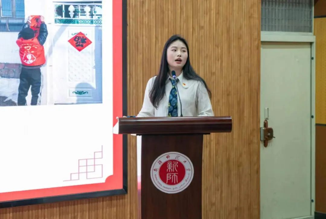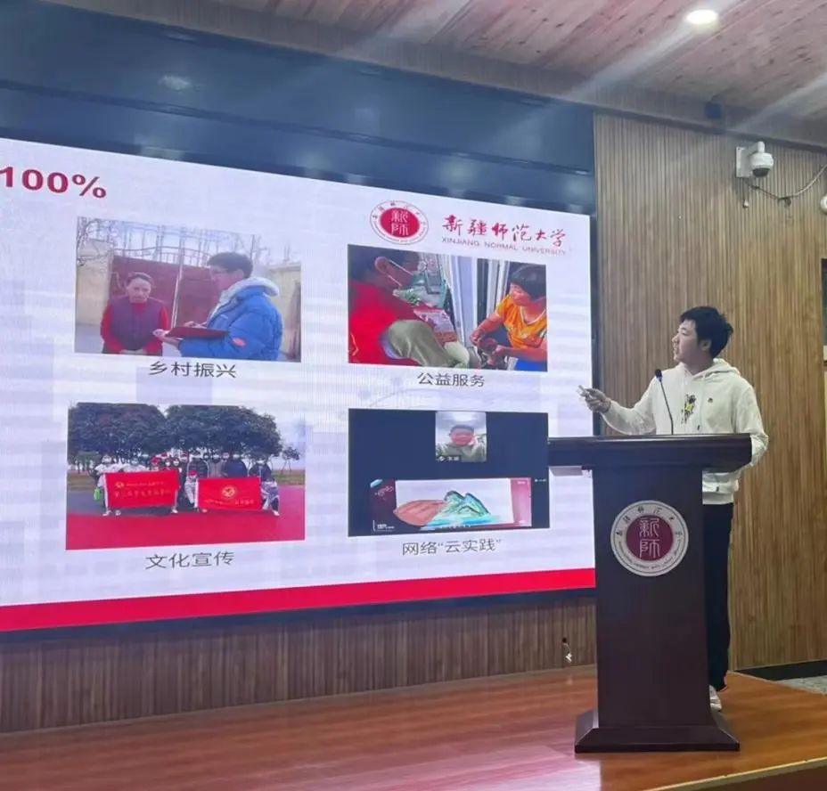 地理科学21-1班团支书任兴宇同学从团支部社会实践前期准备、中期落实、学生现实表现和未来展望四个方面进行了汇报。团支部全员参与,社会实践开展与专业背景结合密切,成员在网络云实践、乡村振兴、志愿服务等板块活动中表现突出,展现出了新师青年的风采。