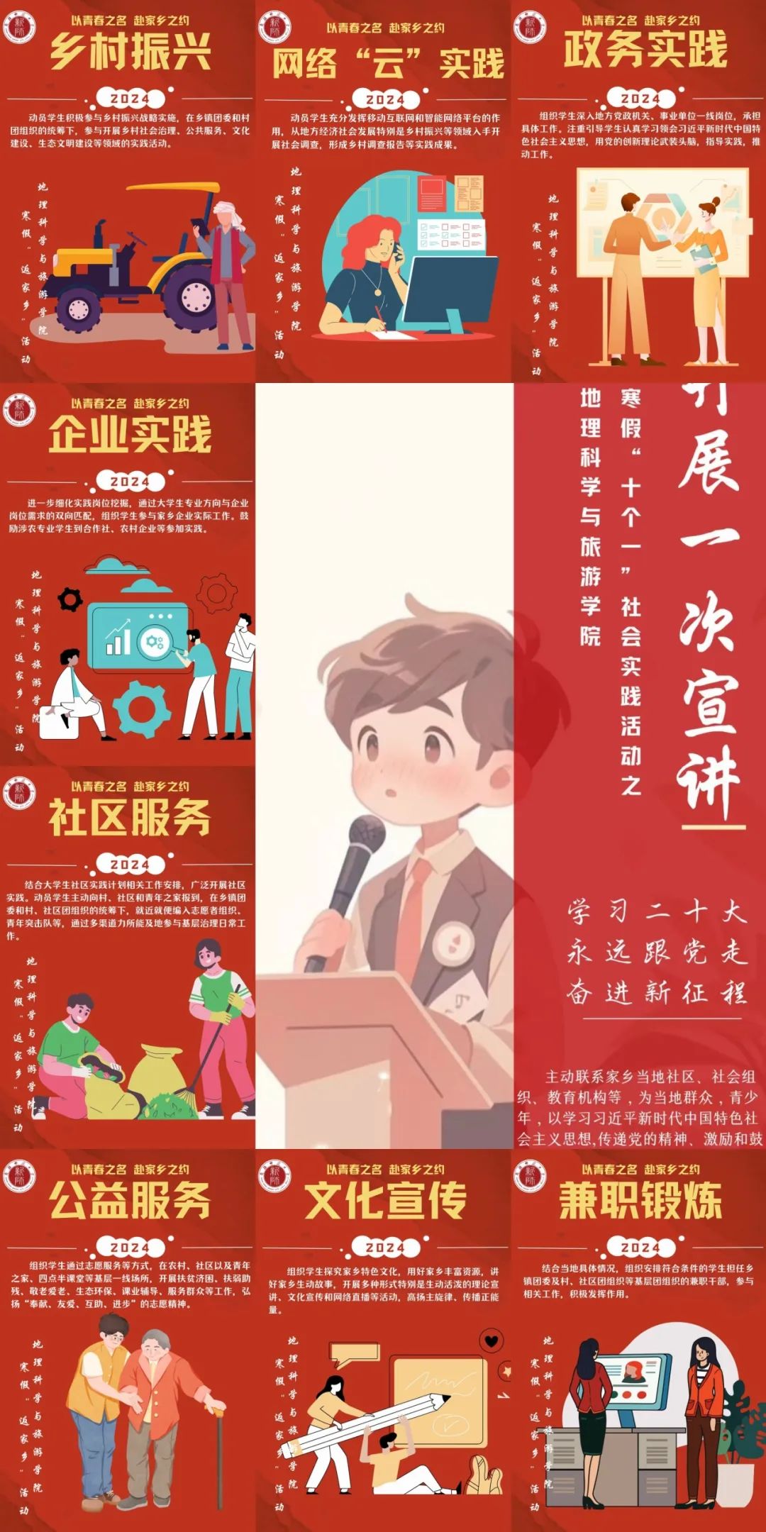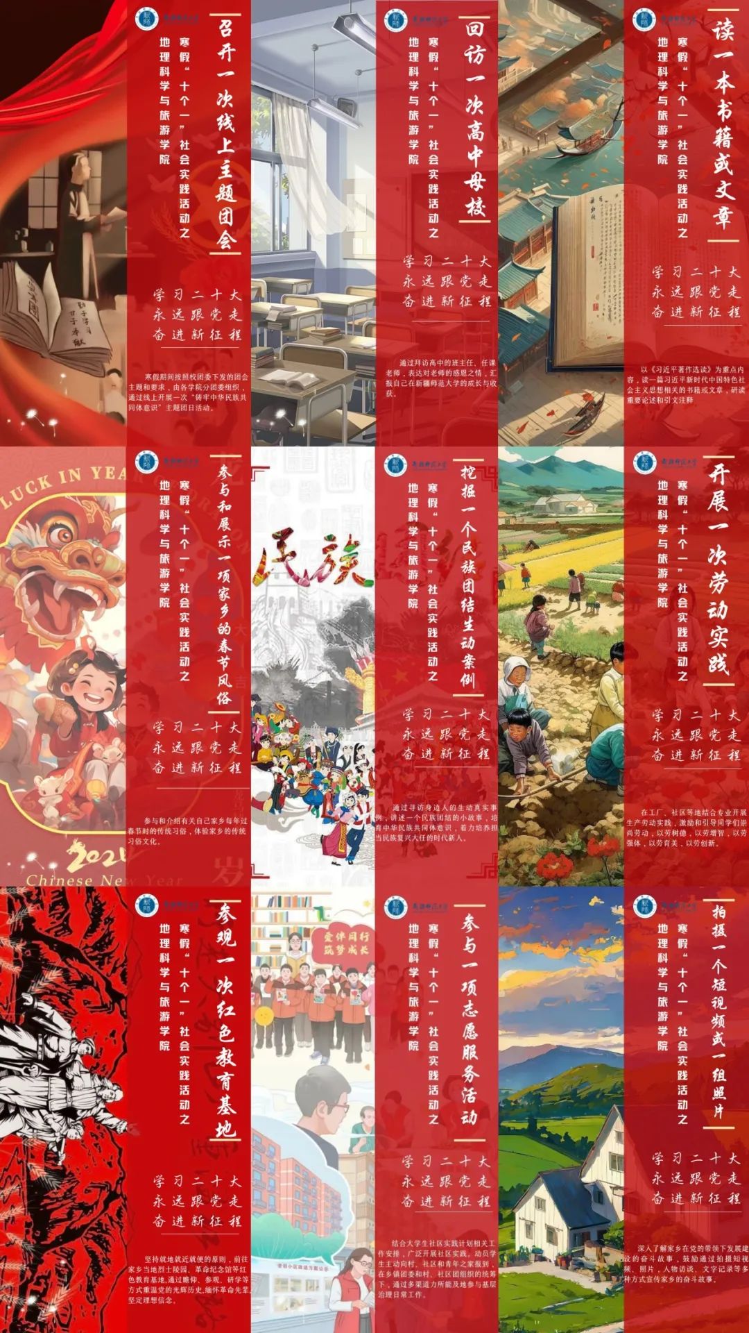 实干笃行,奋发向上。地理科学与旅游学院在寒假期间开展的“以青春之名,赴家乡之约”寒假大学生“返家乡”社会实践及“十个一”主题活动是持续深入学习习近平新时代中国特色社会主义思想的重要载体,切实提升了同学们的社会实践能力与社会服务水平,增强了同学们的社会责任感和使命感。今后,学院会继续将理论学习与实践教育相融合,引导青年大学生将书本知识与社会实践进一步结合,推动学院实践教育取得更好成效。