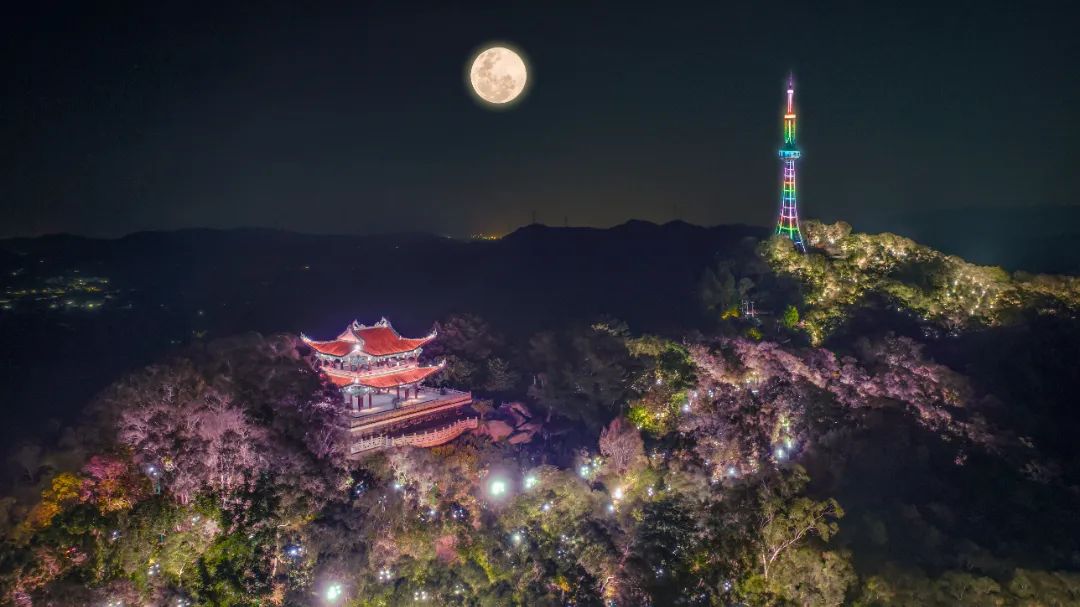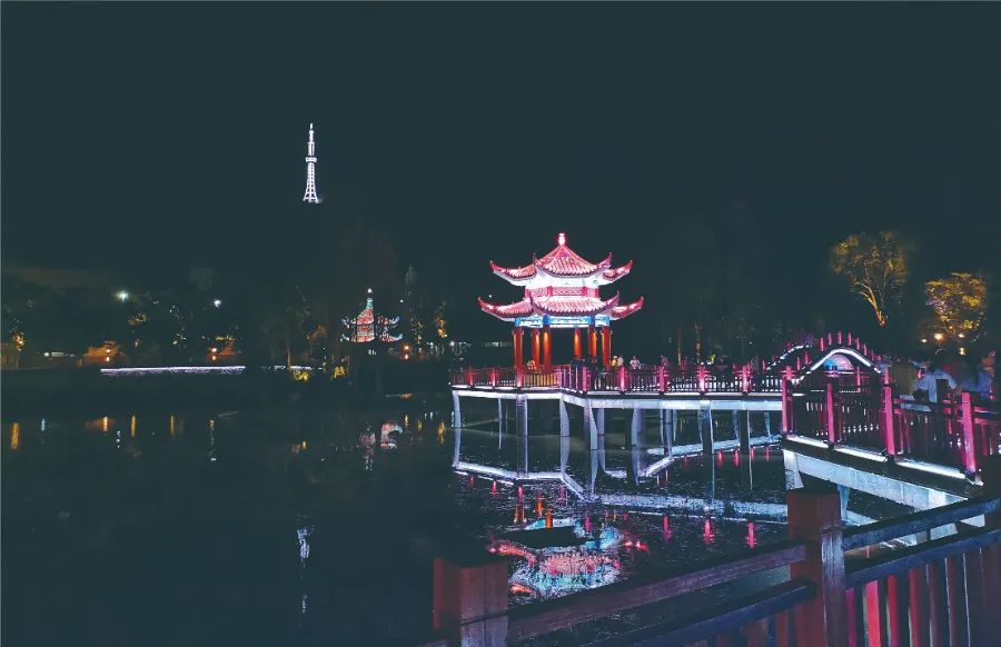 经改造提升的石壁山风景区,夜晚在景观灯的勾勒下灿若银河。栖云山之巅的纳海楼与侧峰的电视塔相映两不厌,引燃万家灯火;恢弘大气的牌坊,“粤东一璧”四字明亮于心,潮汕嵌瓷工艺文化竞绽光芒;花边型的环湖道,落英缤纷,两旁树枝交握,黛瓦白墙,诗意跃然心上;伴着清风明月,书声与欢语,雷音禅寺回荡的古老钟声不再孤寂;丽泽湖则是浓墨重彩的一笔,浮立湖面的云朵块状的景观灯依偎着湖心曲桥,似梦似幻。