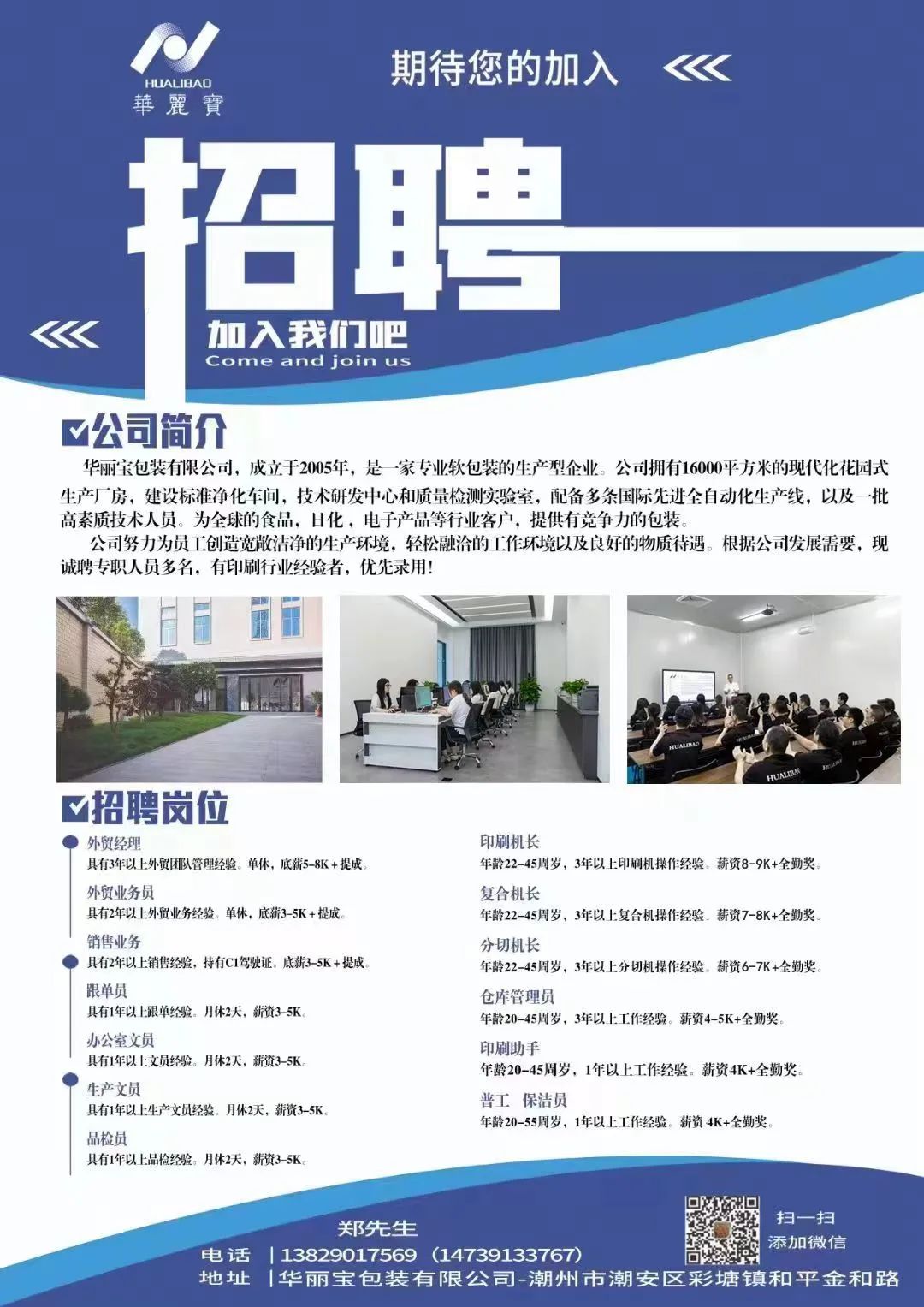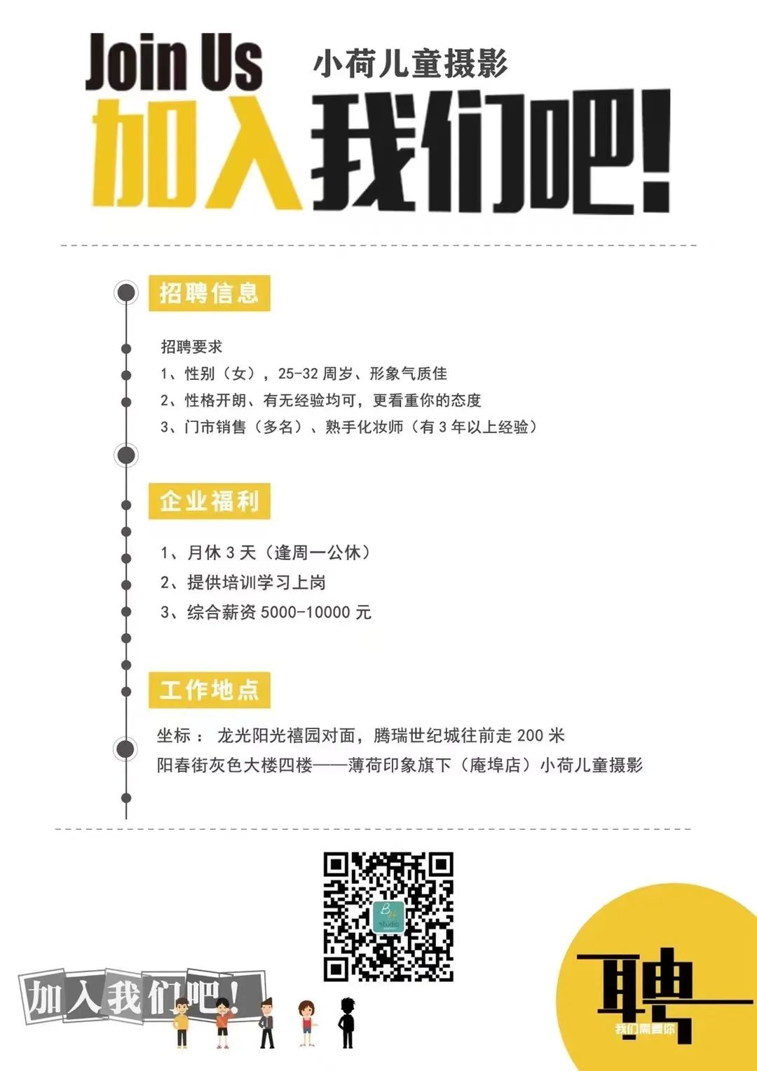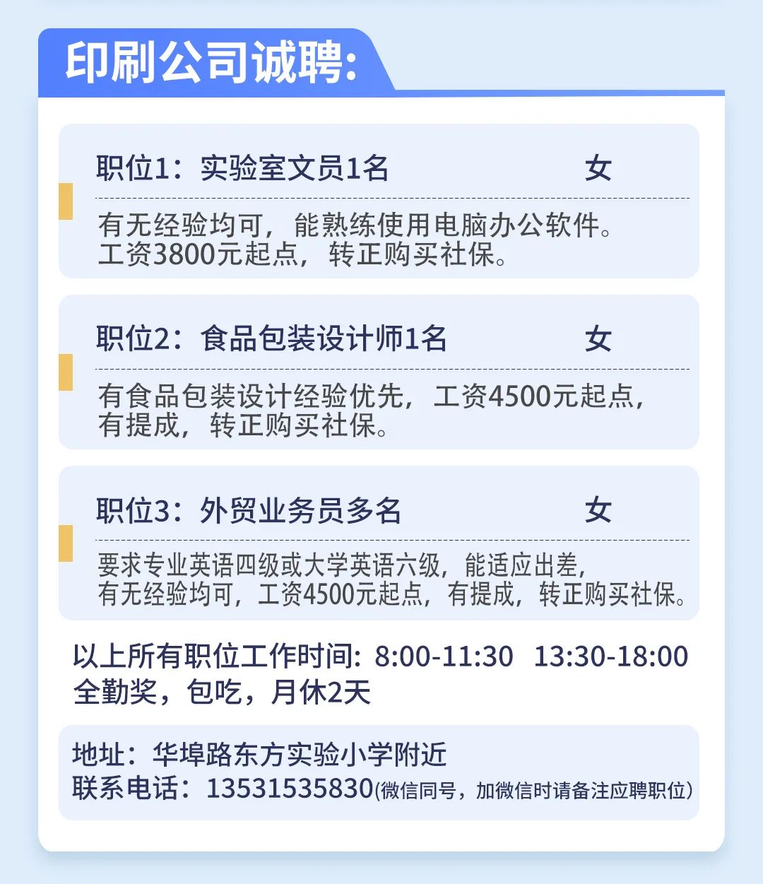 工作时间:8:30-12:00 14:00-18:30,详情面议。联系电话:13727956876/18933044855(或扫一扫添加微信,备注:应聘)