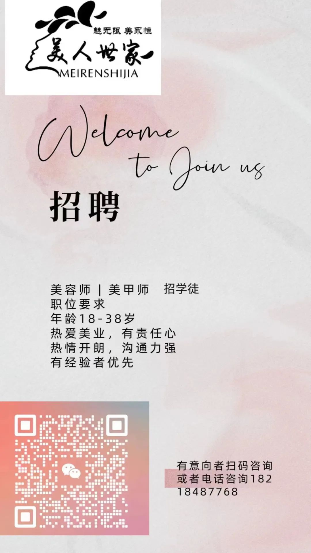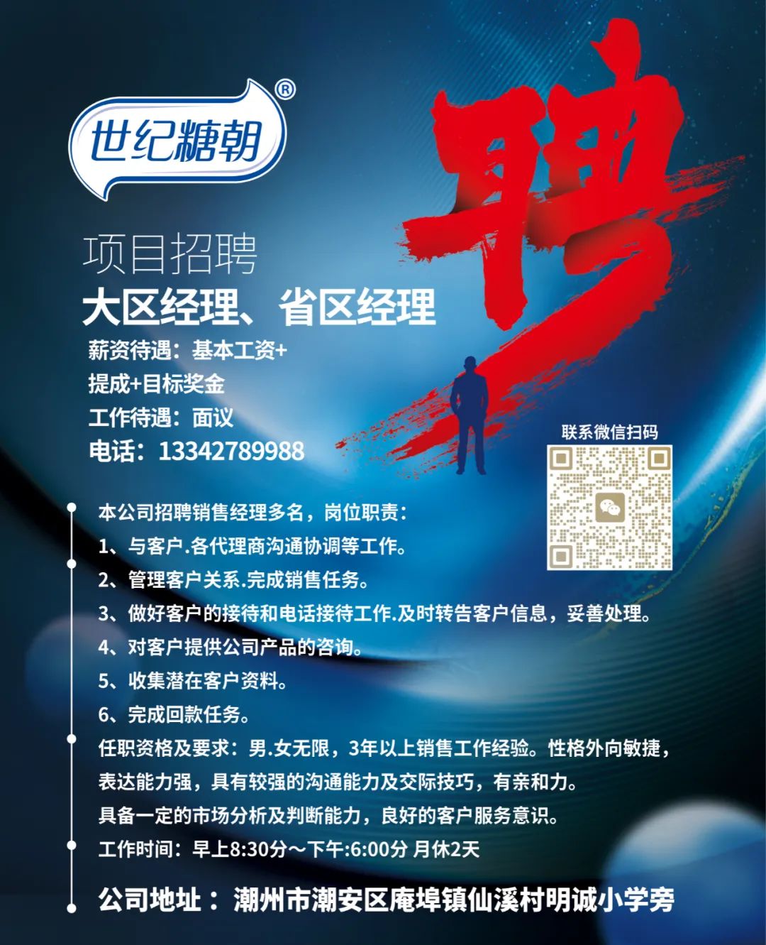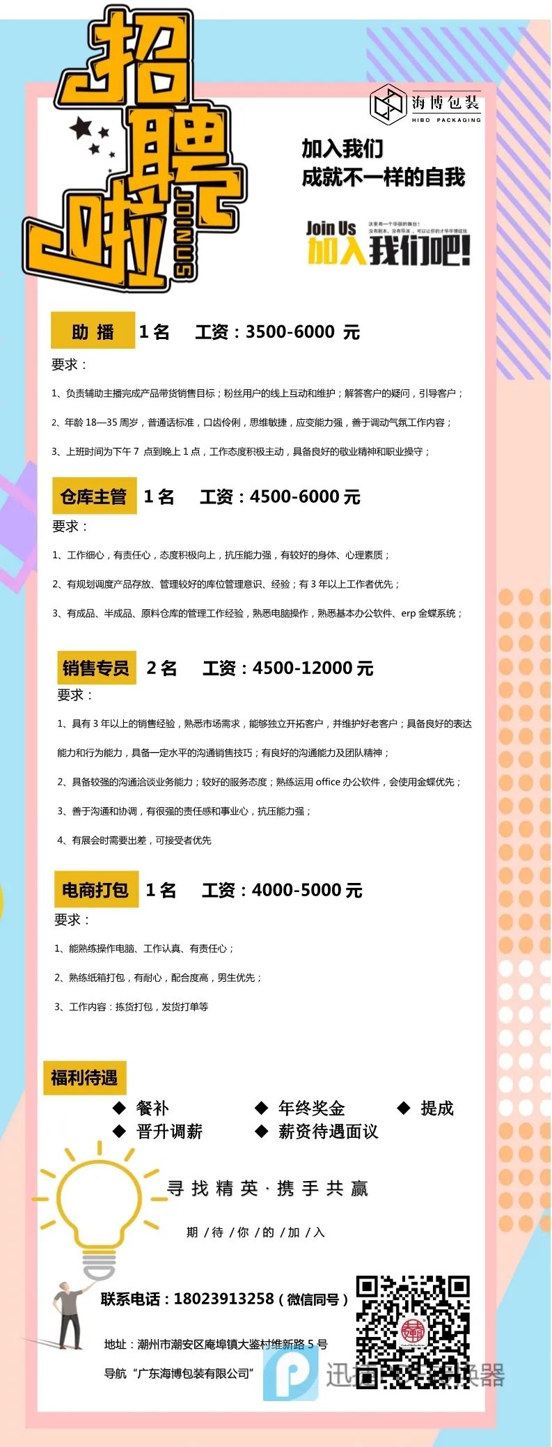 工作时间:8:30-12:00 14:00-18:30,详情面议。联系电话:13727956876/18933044855(或扫一扫添加微信,备注:应聘)