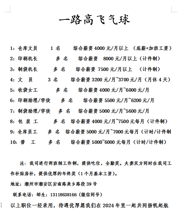 (2)查袋工/收袋工多名,女性,50岁以下,可不需要经验,底薪2700-3300元。