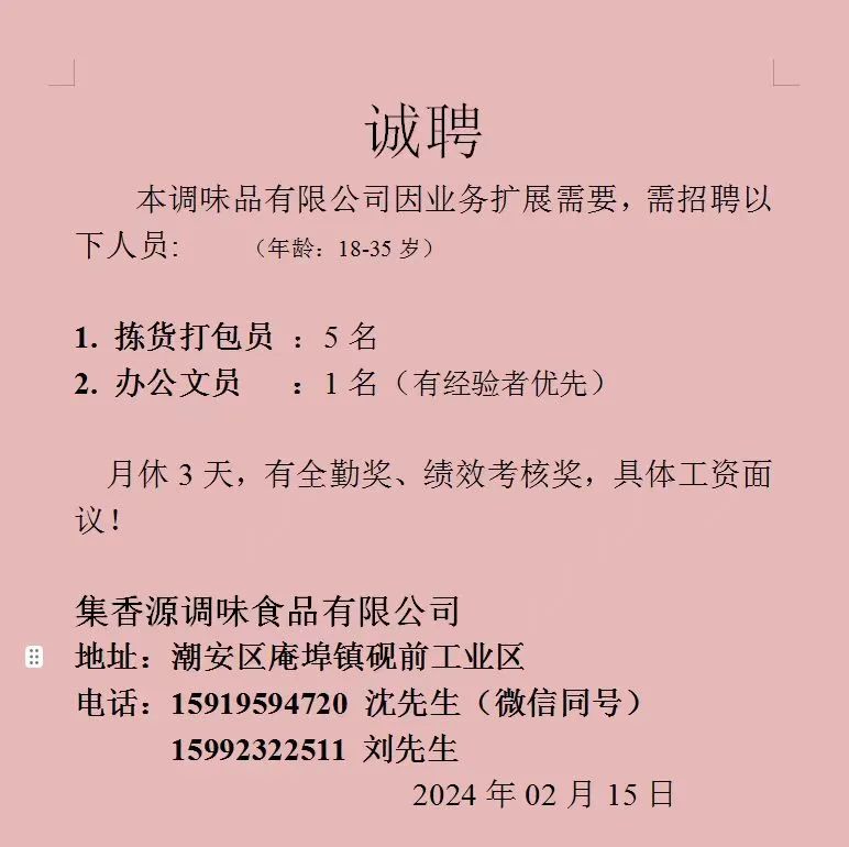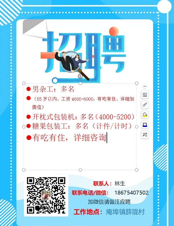 招机修人员、包装工、食堂洗菜工