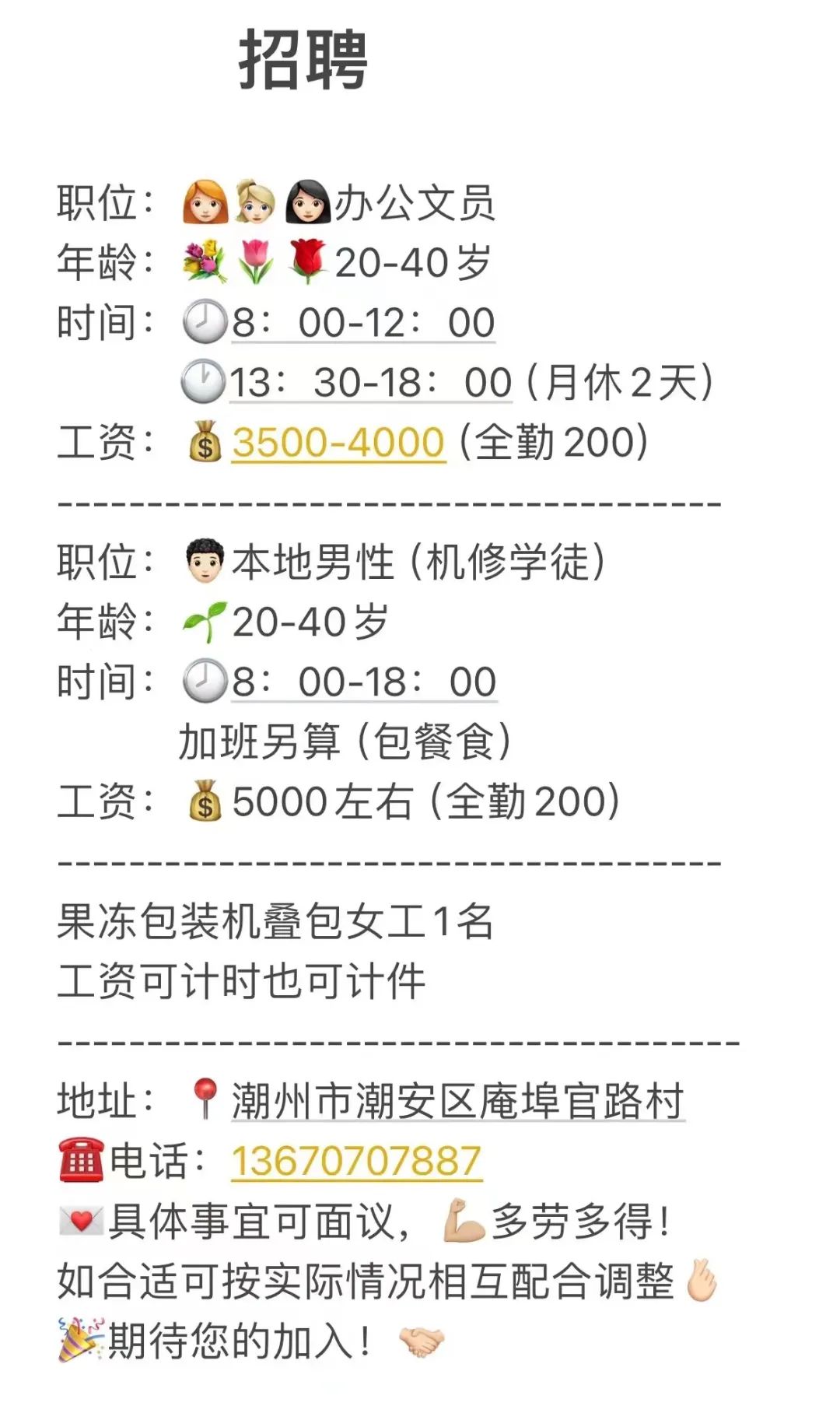 3.杂工2名,(年龄20一45岁)上班时间早8:至下午6点,加班6:30至9:30),要求:责任心强,自觉,主动,上进!有拼博精神!