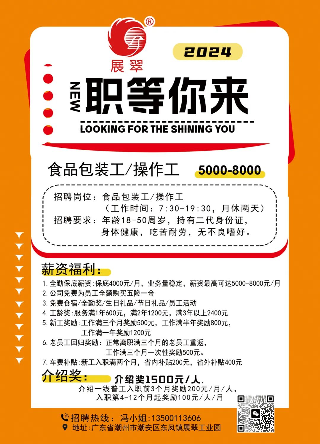 福利待遇:工资+200全勤+100餐补,包吃住,月31天额外加一天工资,设年终