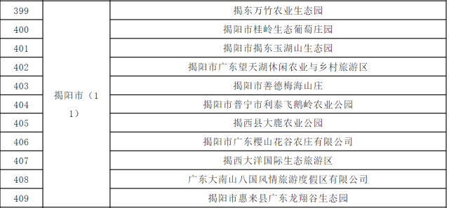 名单显示,经主体申报、县市审核、省组织评审,确定杜阮镇等56个2023年度省级休闲农业与乡村旅游示范单位,广州市花都区宝桑园蚕桑特色休闲农业示范基地等433个前十批省级休闲农业与乡村旅游示范点通过监测,继续保留“广东省休闲农业与乡村旅游示范点”称号。其中,揭阳市普宁市入选2023年度省级休闲农业与乡村旅游重点县名单,揭东万竹农业生态园、揭阳市普宁市利泰飞鹅岭农业公园等11个省级休闲农业与乡村旅游示范点监测合格。