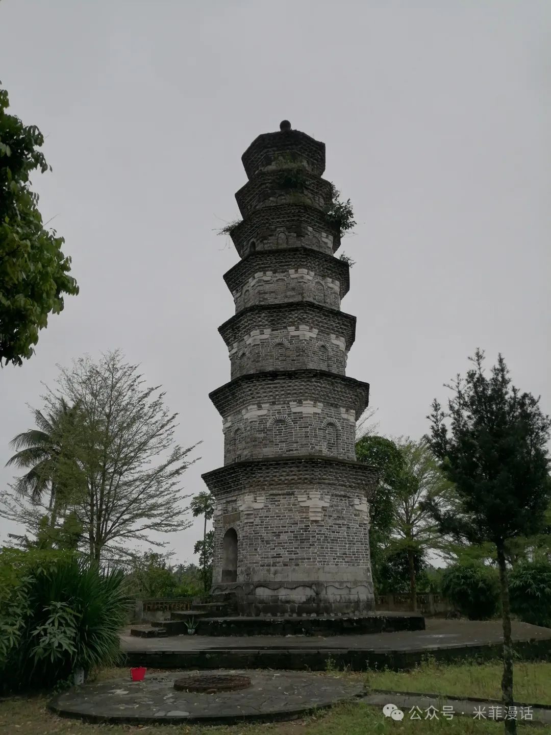 我们没有在琼海停留,按计划落脚点是长坡镇。路过塔洋镇时远远望见一古塔矗立路边,走到近前见大门洞开就进园参观。此塔匾额上写着“聚奎塔”,没有文字说明,遂不知建造年月。古塔砖石结构,共七层,最底层小厅三四平米大小,供奉牌位上看不清写的什么字,香案上蜡烛还燃着,看来是有人管理的,只是管理员不时时在岗。古塔四周有围墙,但整个院落杂草丛生,空无一人。塔后有几块石碑,没有一块字迹清晰可读。转了一圈也不知道这“聚奎塔”的前世今生,失望离开。